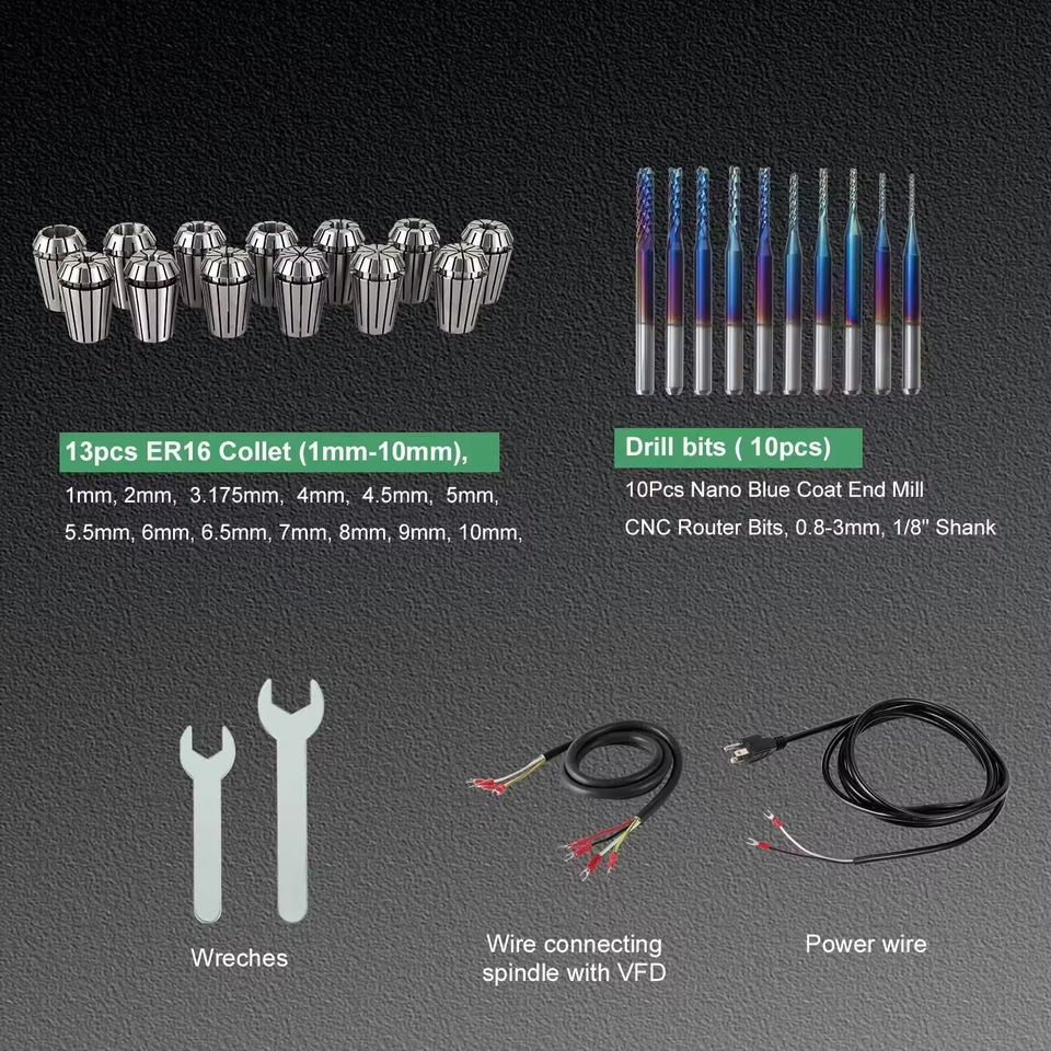 Whole Set High Precision ER16 1.5KW 80mm 110V/220V/380V Air Cooled CNC Spindle Motor with VFD Inverter+Collets+Drills