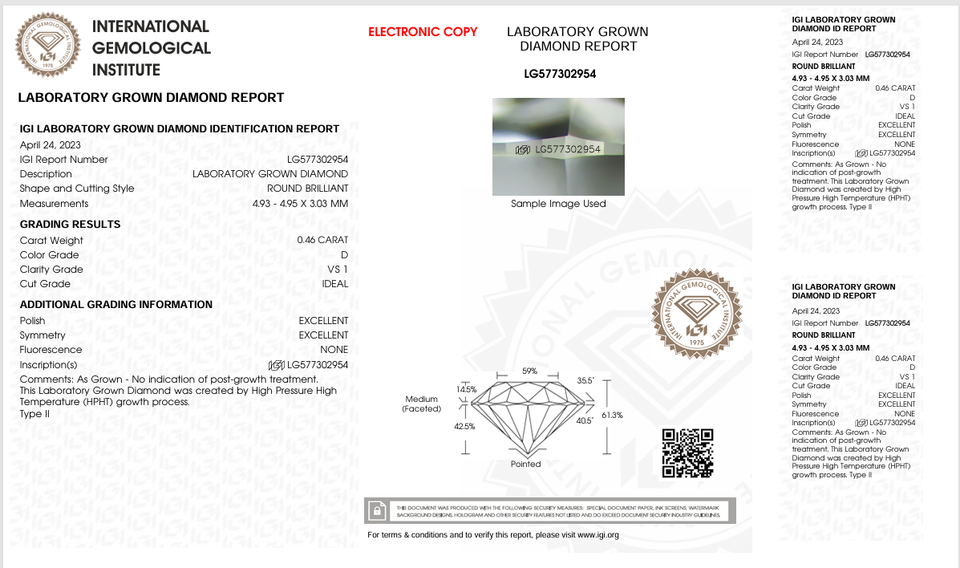 เพชรหลวมเจียระไนแบบบริลเลียนต์ น้ำหนัก 0.46 กะรัต ความสะอาดระดับ VS1 สี D ผลิตด้วยวิธี CVD ผ่านการเจาะด้วยเลเซอร์ ได้รับการรับรองจาก IGI เหมาะสำหรับการขายส่ง