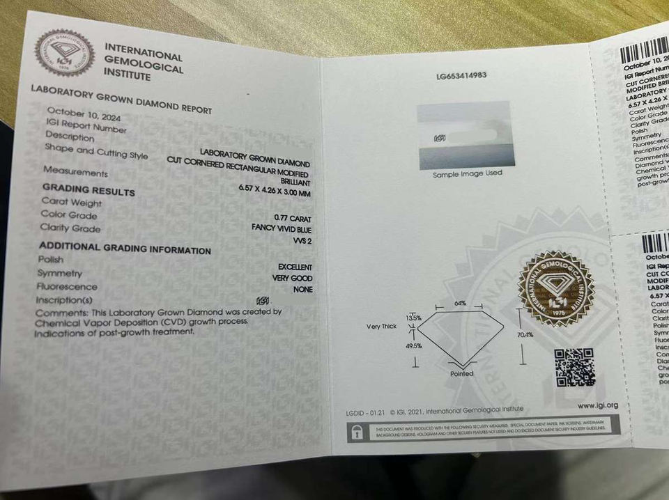 เพชรเม็ดเดี่ยวทรงเรเดียนท์ 0.77 กะรัต สีฟ้าสดใส รับรองโดย IGI ความสะอาดระดับ VVS เพชรเพาะเลี้ยงในห้องปฏิบัติการ CVD สำหรับทำเครื่องประดับ ขายส่ง