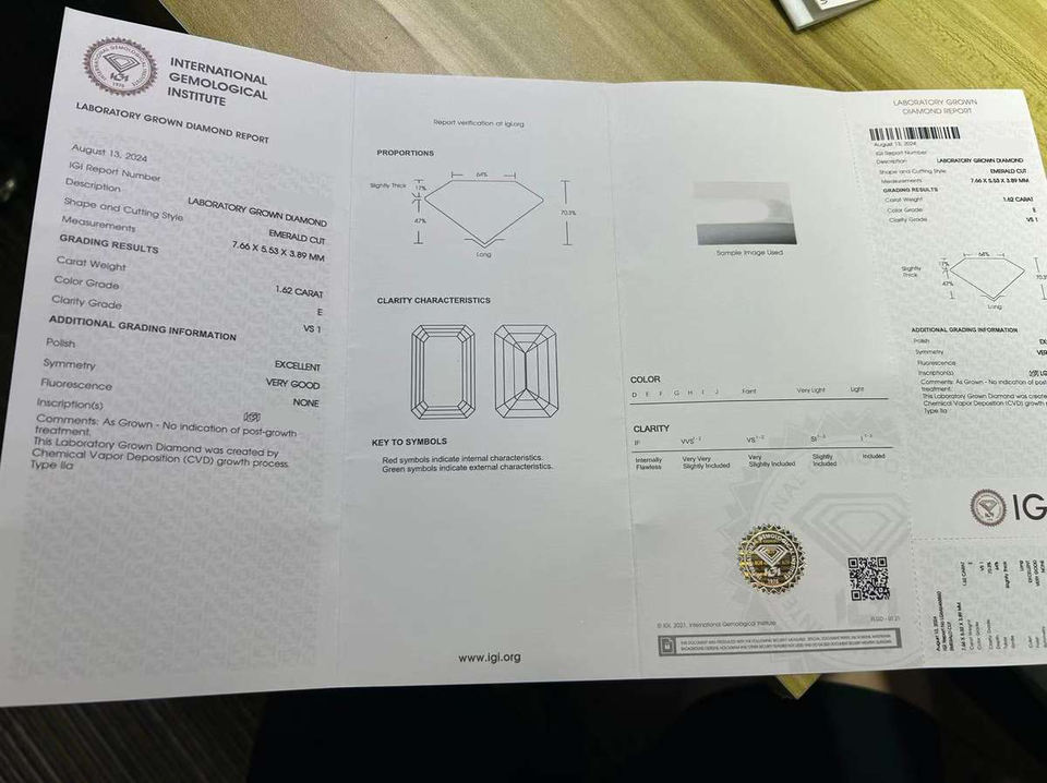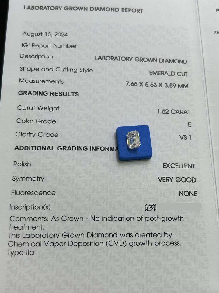 เพชรเม็ดเดี่ยวทรงเหลี่ยมมรกต 1.58 กะรัต/1.62 กะรัต รับรองโดย IGI ความสะอาดระดับ VVS เพชรหลวมสำหรับทำเครื่องประดับ เพชรขาว CVD ผลิตในห้องปฏิบัติการ