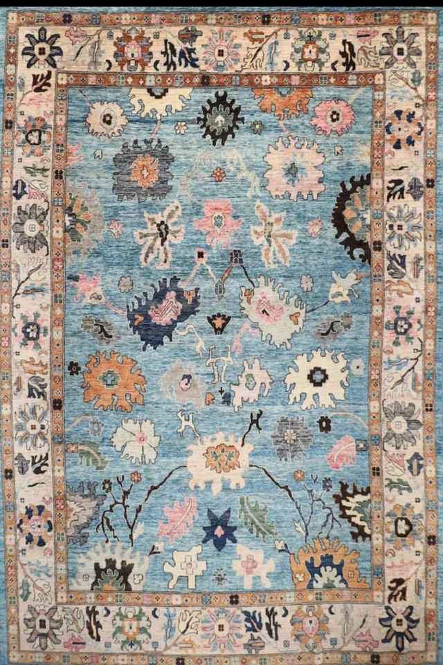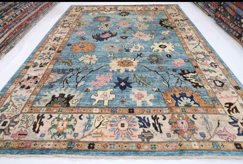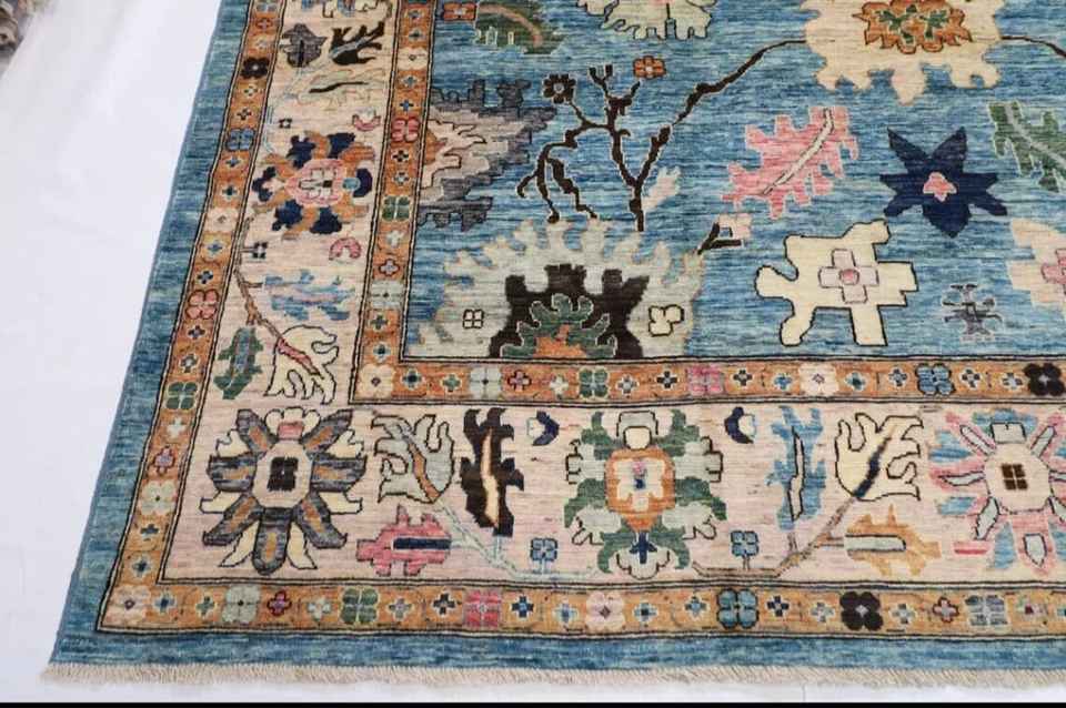 พรมปูพื้นสีฟ้า10X14ฟุตผ้าวูลย้อมสีแบบถักมือสไตล์อัฟกานิสถานปรับแต่งได้สำหรับห้องนั่งเล่นออกใหม่