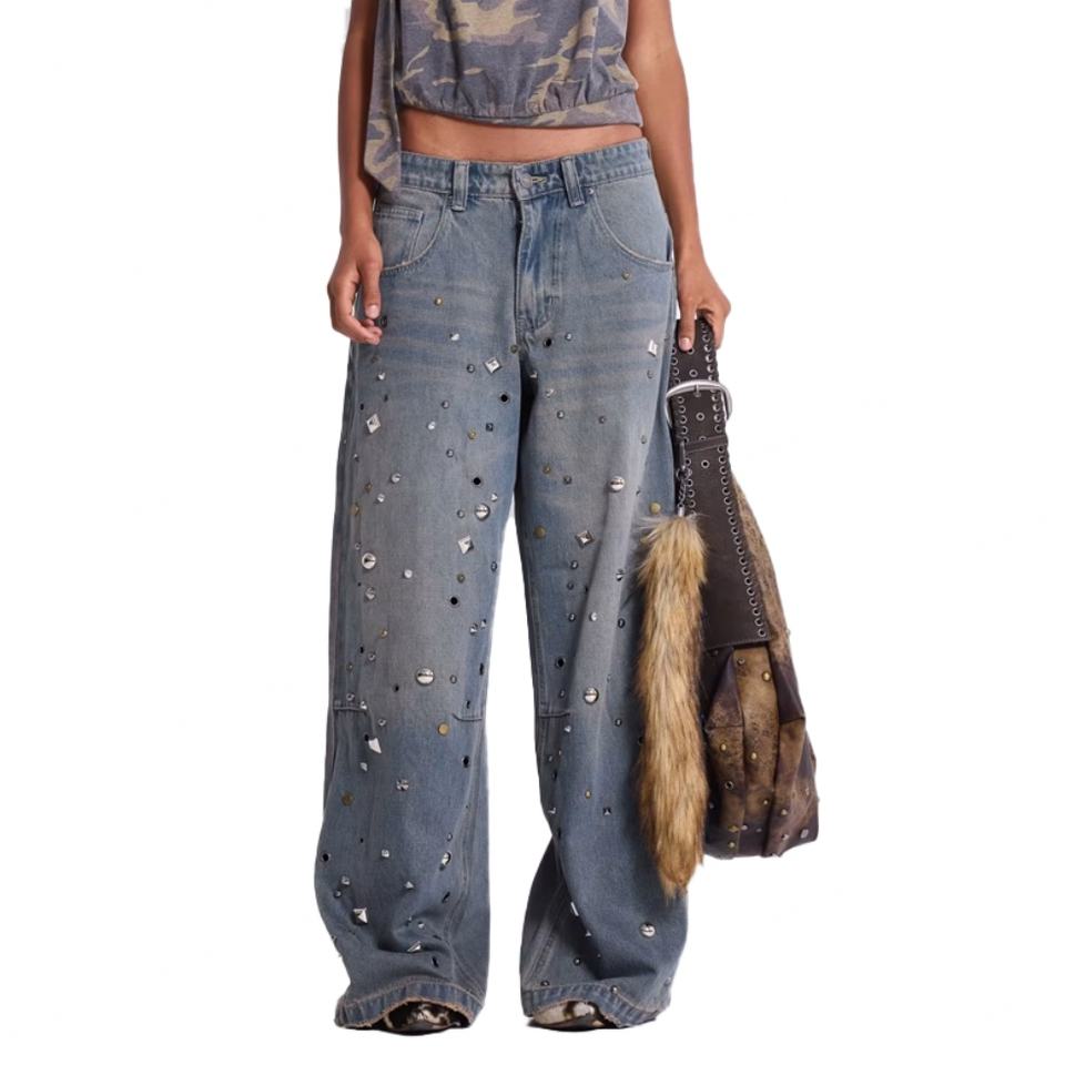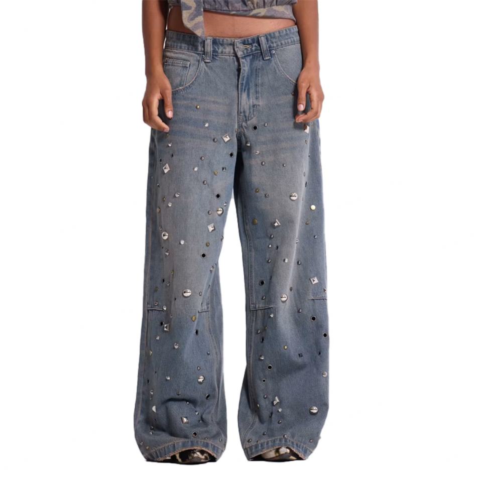 กางเกงยีนส์ผู้ชายทรงโอเวอร์ไซส์ สไตล์สเก็ตบอร์ด ผ้าเดนิมหนา 100% คอตตอน ขายส่ง สีเทา-น้ำเงินฟอก แต่งหมุดยึดแบบโคลอสซัส เอวต่ำ