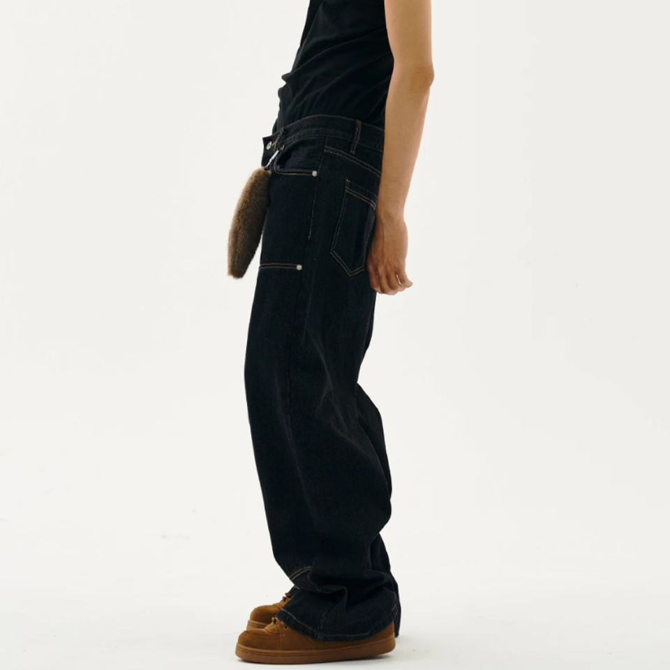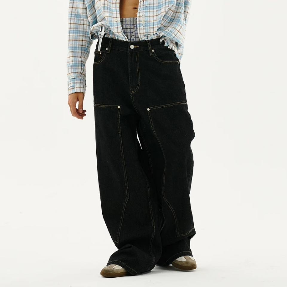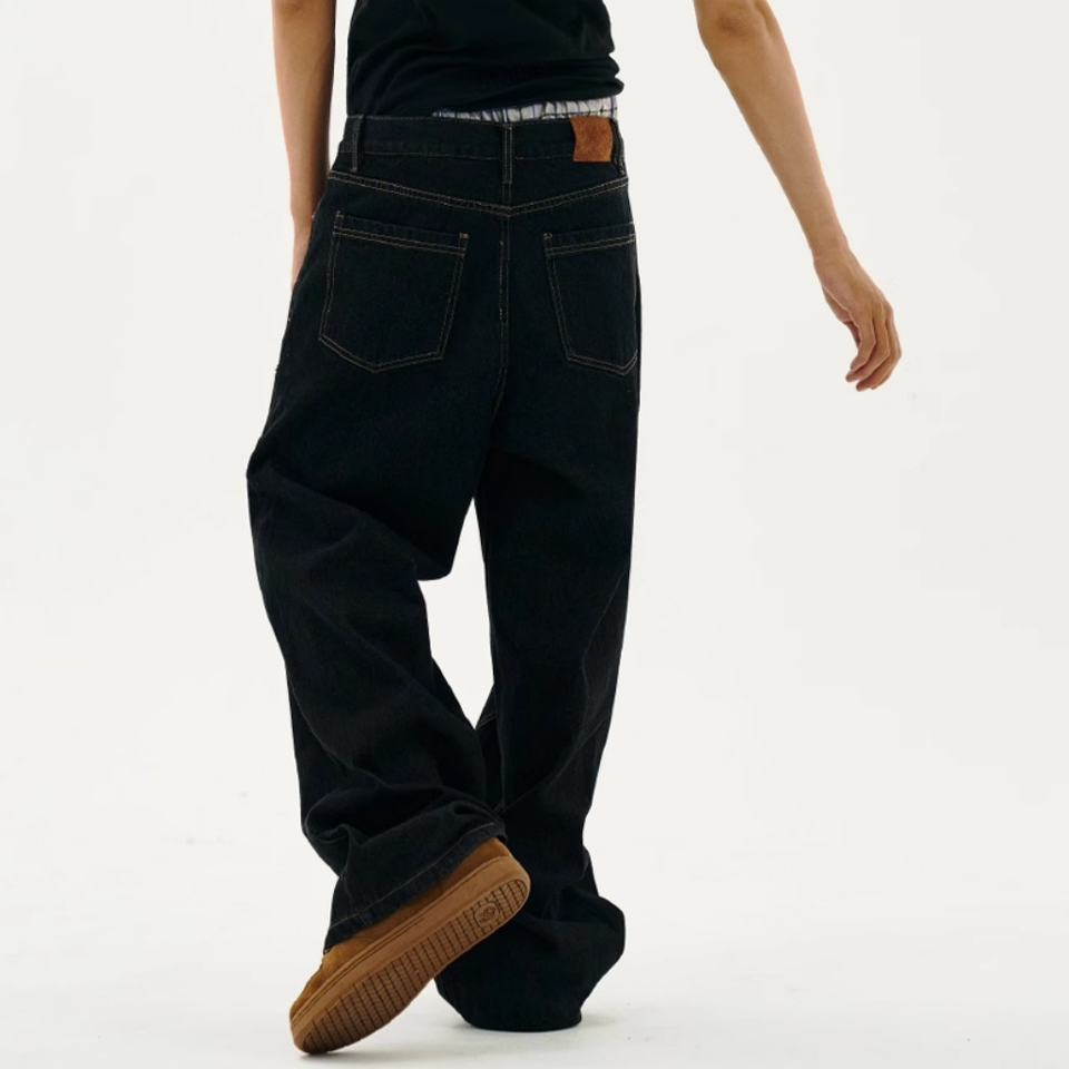 กางเกงยีนส์เดนิมดิบผ้าฝ้ายแท้ 100% ทรงหลวมเอวกลาง ขาตรง เย็บเข่าสองชั้น คุณภาพสูง สไตล์ลำลอง สำหรับผู้ชาย ขายส่ง