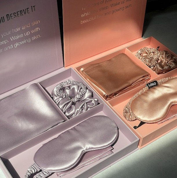 ขายส่งปลอกหมอนผ้าไหมหรูหราหม่อน 100% พร้อมกล่องของขวัญโลโก้มาส์กตาไหมและปลอกหมอนพร้อมที่นอน