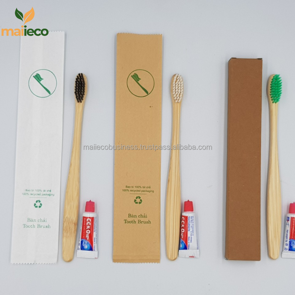 คำอธิบาย:แปรงสีฟันไม้ไผ่ธรรมชาติและย่อยสลายได้ใช้ในบ้านของโรงแรมออร์แกนิก