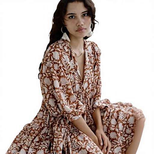 เดรสยาวลายดอกพิมพ์ลายบล็อกด้วยมือ 100% ออร์แกนิค ยี่ห้อ Kyra สีคาราเมล สไตล์โบฮีเมียน ผ้าฝ้าย สำหรับใส่ไปชายหาด ขายส่ง