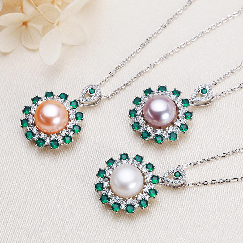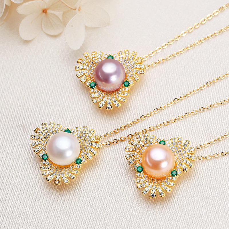 สร้อยคอมุกน้ำจืดแท้ทรงกลมแบนขนาด 10 มม. ชุบทองแท้ พร้อมตัวล็อคแบบเซอร์โคเนีย ดีไซน์จี้สวยหรู