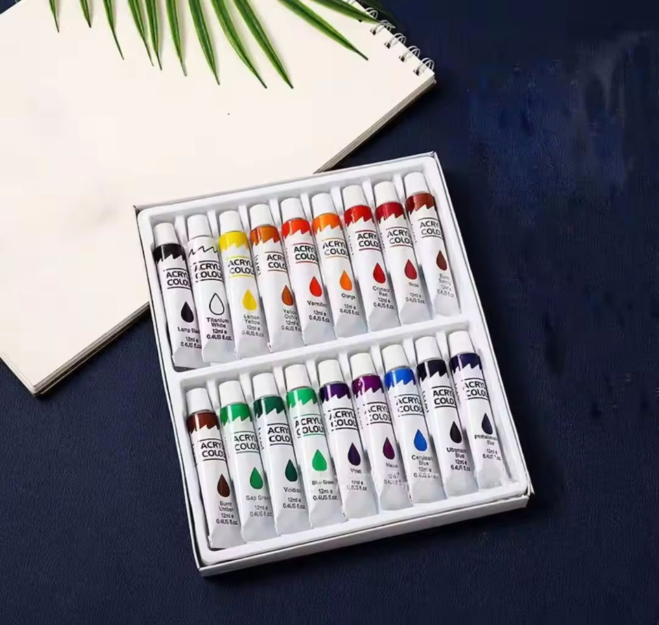 ชุดสีอะคริลิคแบบขายส่ง ขนาด 12 มล. เนื้อสีกึ่งด้าน 12 สี สำหรับวาดภาพบนผ้าใบ ไม้ ผ้า และงานวาดเขียนในโรงเรียน