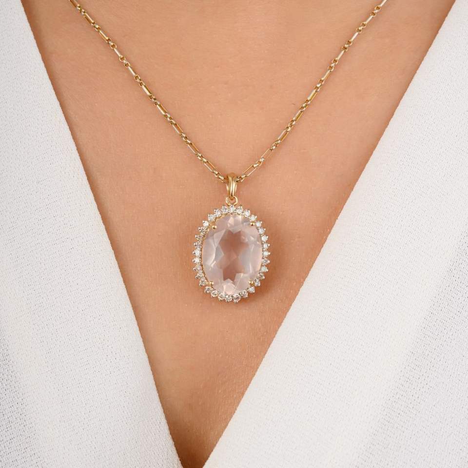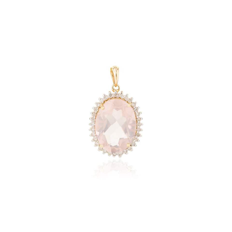 เครื่องประดับจี้ทองเหลืองแท้14K สำหรับผู้หญิงเครื่องประดับทรงรีธรรมชาติตัดรูปกุหลาบควอตซ์ด้วยเพชรสำหรับงานแต่งงาน