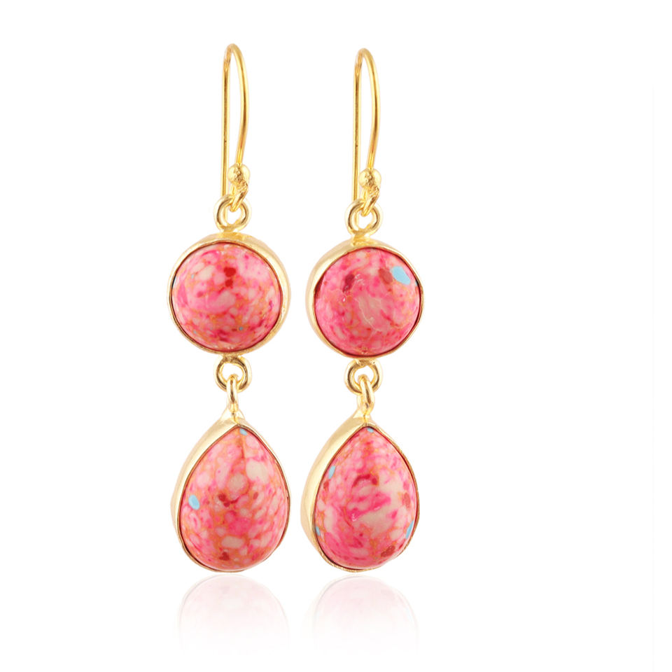 ต่างหูทองเหลืองชุบทอง18K ทำด้วยมือมีไข่มุกสังเคราะห์สีชมพูเทอร์ควอยซ์