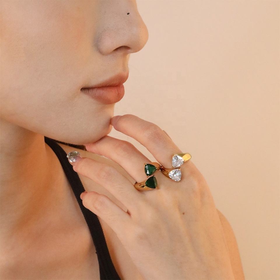 แหวนแฟชั่นชุบทอง 18K สำหรับผู้หญิง วัสดุสแตนเลส ประดับเพชรคิวบิกเซอร์โคเนียรูปหัวใจสีเขียวคู่ ดีไซน์เปิดวงแหวน ขายส่ง