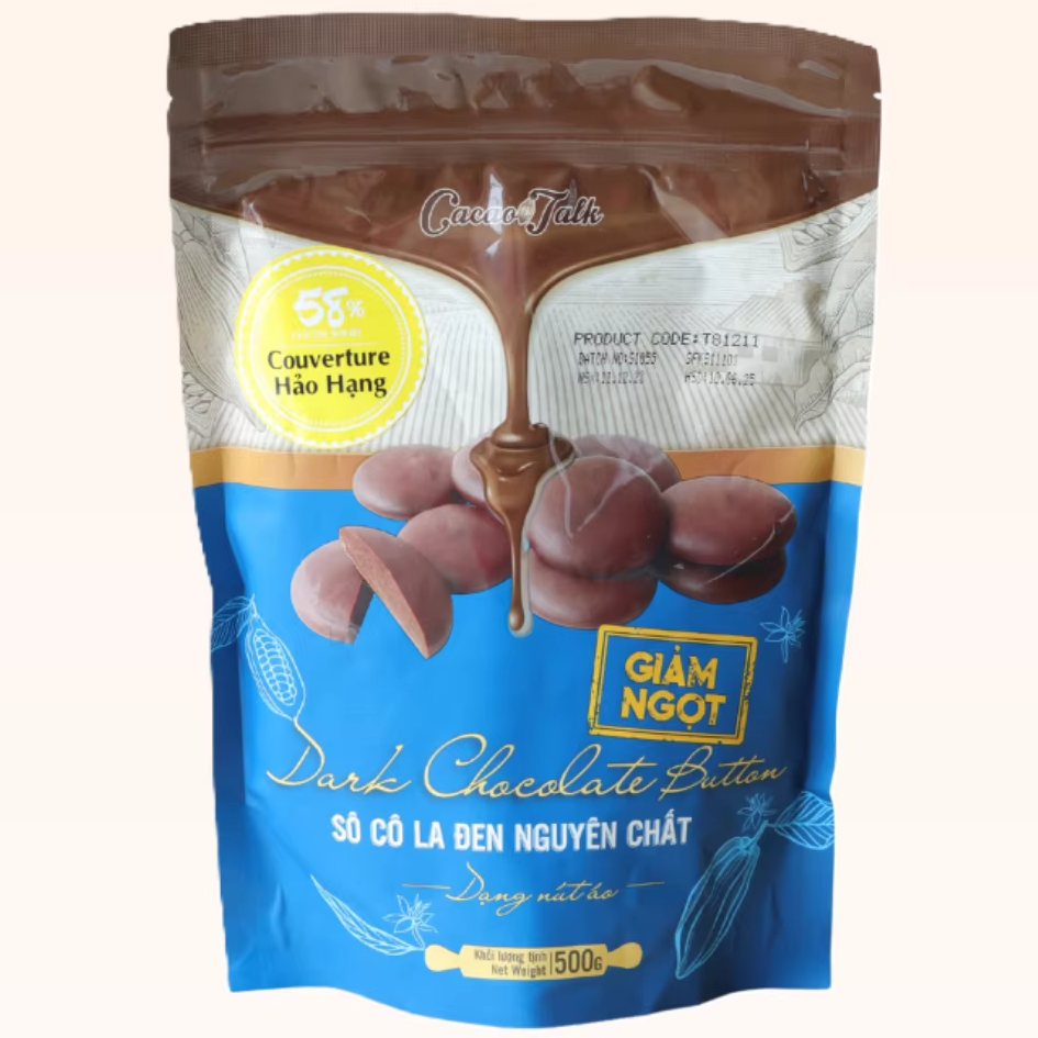 กระดุมดาร์กช็อกโกแลตแท้1กก. ลาย58% รสขมโกโก้พิมพ์ลายฮาลาล