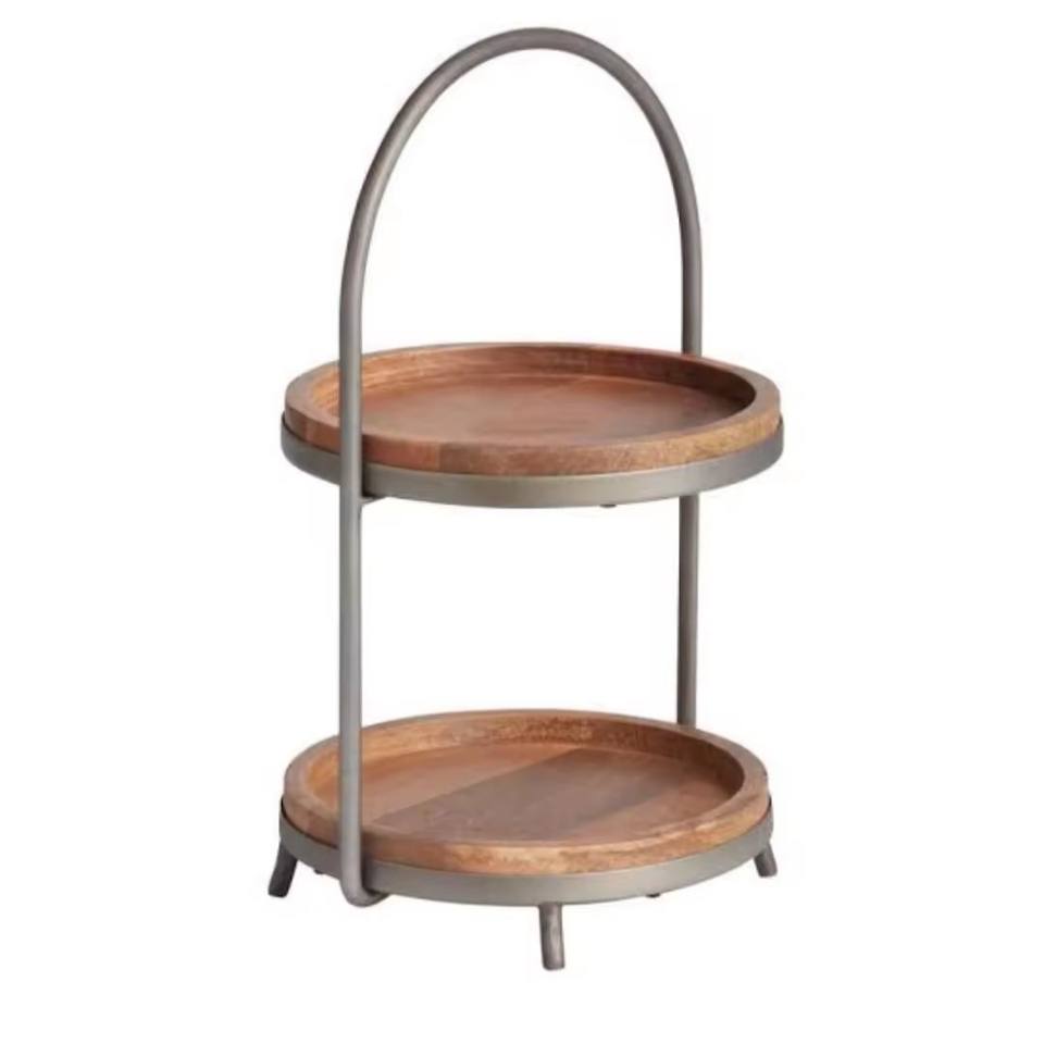 แท่นวางเค้กไม้อะคาเซีย2ชั้นเครื่องมือขนมหวานหรูหราพร้อมถาดคัพเค้กโลหะแบบกำหนดเองสำหรับงานแต่งงานและงานปาร์ตี้