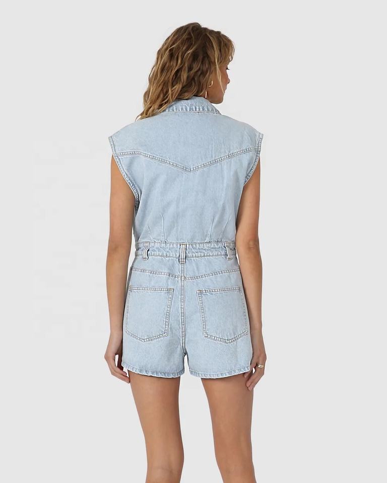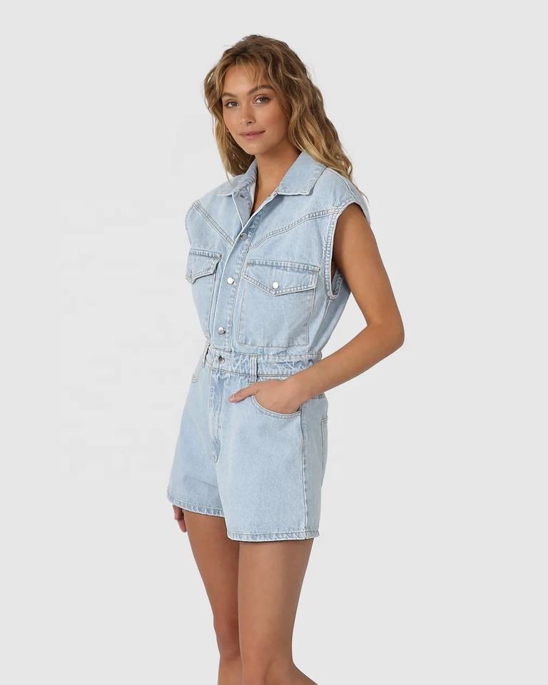จั๊มสูทเดนิมแขนกุดสีพื้นถักลายมัดย้อมระบายอากาศดีสำหรับผู้หญิง คอลเลคชั่นฤดูใบไม้ร่วงปี 2022 ขายส่ง