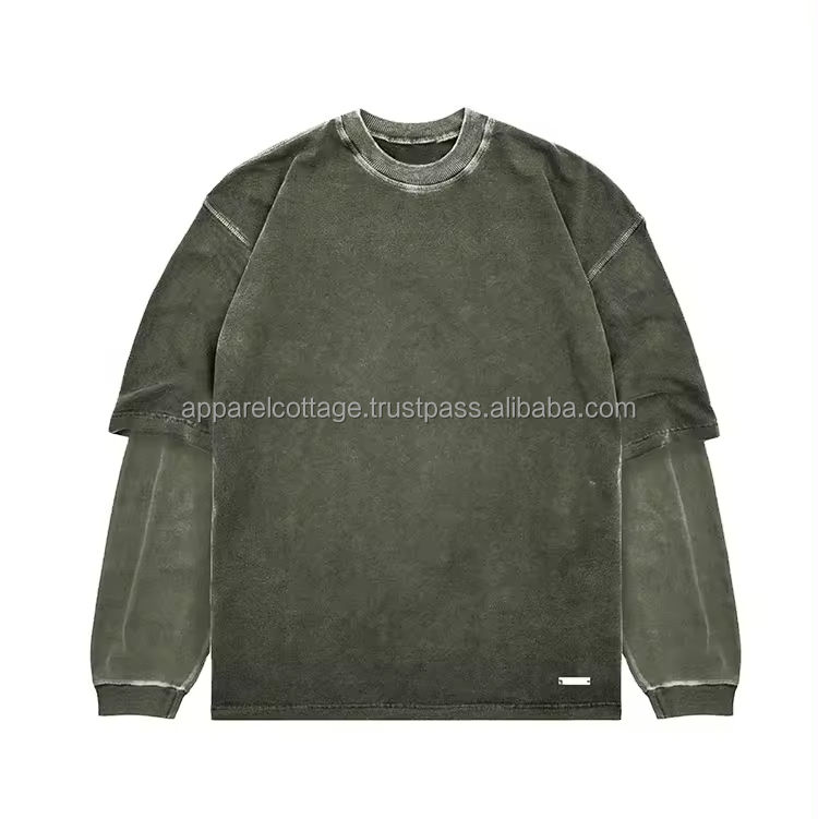 เสื้อสเวตเตอร์2025ชายซักสองชั้นแนวสตรีทวินเทจเสื้อยืดใส่ฝึกซ้อมปล่อยไหล่โอเวอร์ไซส์