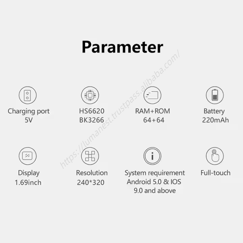 ฟังก์ชัน:นาฬิกาปลุก, เครื่องติดตามการนอนหลับ, วัดความเร็ว, เครื่องติดตามสุขภาพ