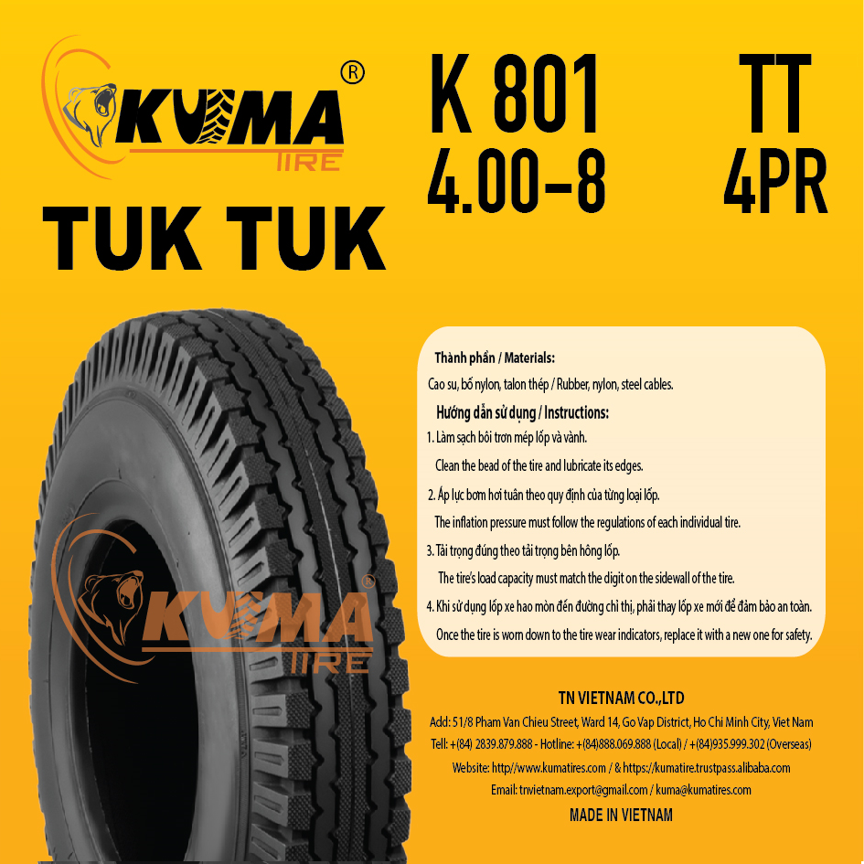 ยางในรถตุ๊กตุ๊ก รุ่น K802 4.00-8 ขายส่ง ผลิตที่เมืองโฮจิมินห์ รับประกัน 12 เดือน