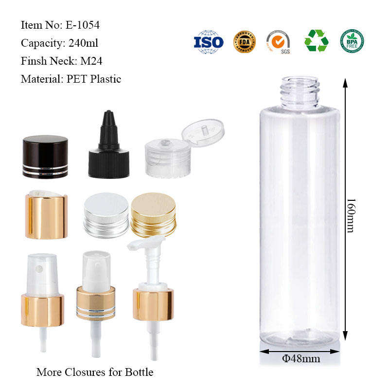 ขวด PET ทรงกระบอกใส ขนาด 240 มล. 8 ออนซ์ พร้อมหัวปั๊มสเปรย์ สำหรับโลชั่น ผลิตภัณฑ์บำรุงผิว เซรั่ม น้ำมันใส่ผม โทนเนอร์ บรรจุภัณฑ์แบบกำหนดเอง ขายส่ง