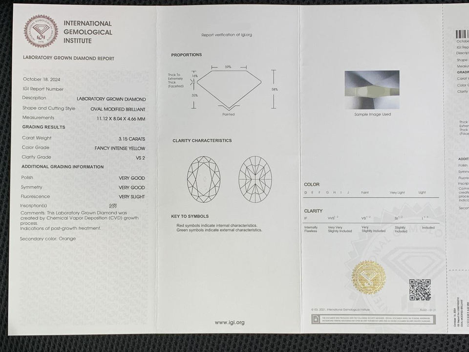 เพชรหลวมทรงรี 3.15 กะรัต สีเหลืองเข้มแฟนซี รับรองโดย IGI ความสะอาดระดับ VVS2 เพชรเพาะเลี้ยงในห้องปฏิบัติการ CVD สำหรับทำเครื่องประดับ ขายส่ง