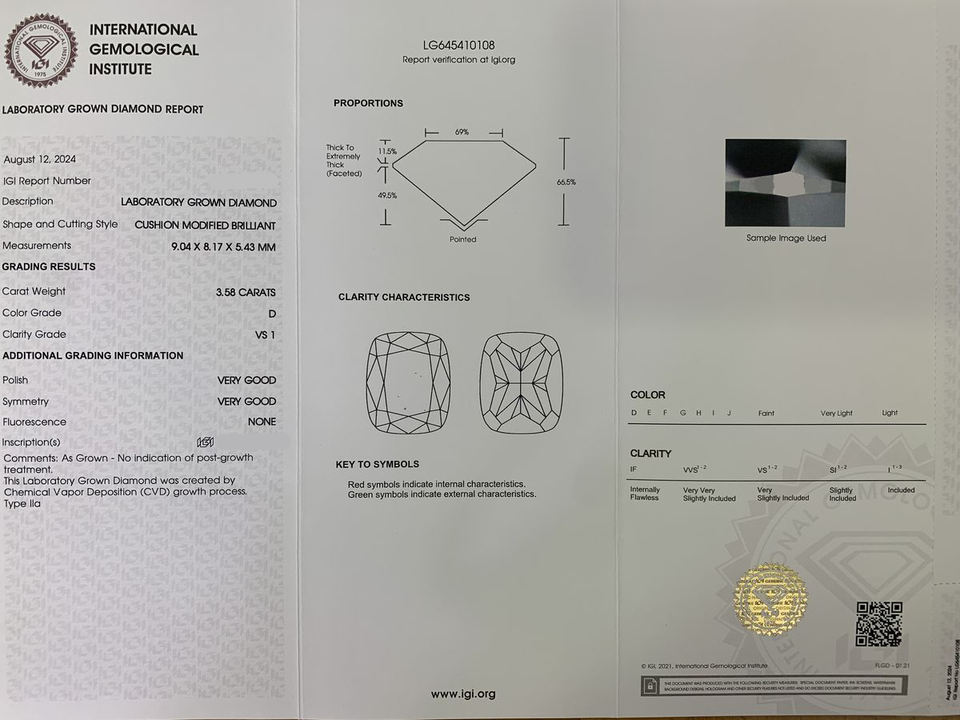 เพชรทรงคุชชั่น 3.23 กะรัต ขายส่ง ได้รับการรับรองจาก IGI ความสะอาดระดับ VVS เพชรขาวเพาะเลี้ยงในห้องปฏิบัติการ CVD เพชรเม็ดเดี่ยวสำหรับทำเครื่องประดับ