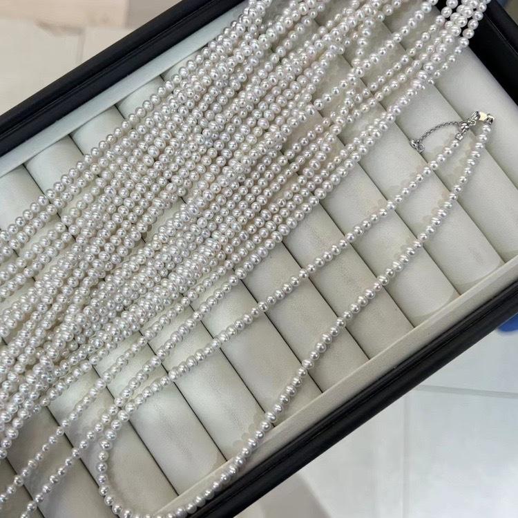 สร้อยคอมุกน้ำจืดทรงเกือบกลม ขนาด 3-4 มม. ความเงางามสูง คุณภาพสูง พร้อมสร้อยเงินแท้สำหรับเด็ก