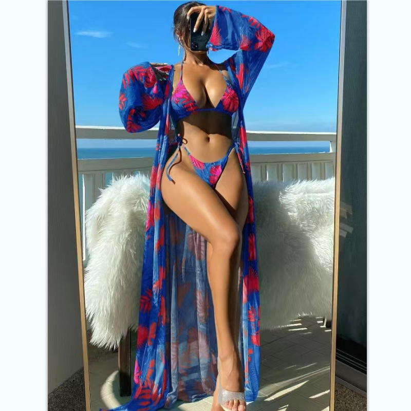 ชุดว่ายน้ำบิกินี่ 3 ชิ้น แบบผูกคอ ลายดอกไม้ พร้อมผ้าคลุม แห้งเร็ว ผลิตจากโพลีเอสเตอร์/คอตตอน สำหรับผู้หญิง ขายส่ง