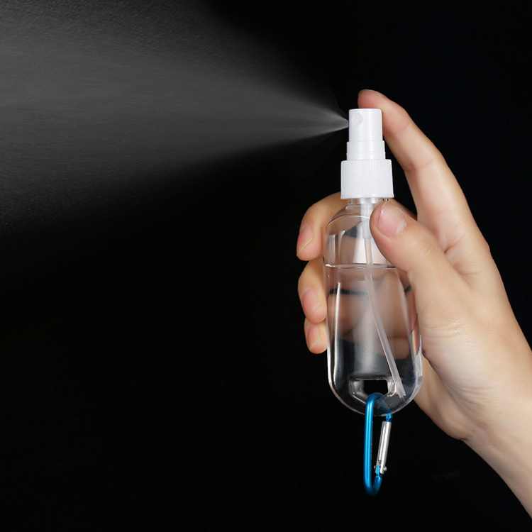 ขวดเจลแอลกอฮอล์แบบพกพาพร้อมหัวปั๊มสเปรย์ ขนาด 30 มล. 50 มล. 60 มล. 80 มล. วัสดุ PETG พร้อมห่วงคล้องกุญแจ ขายส่ง