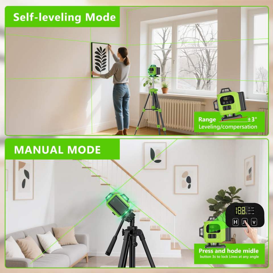 เครื่องวัดระดับเลเซอร์สีเขียว 3 มิติ/4 มิติ แบบ 360 องศา 12/16 เส้น สำหรับงานอุตสาหกรรม/งาน DIY พร้อมแบตเตอรี่ลิเธียม