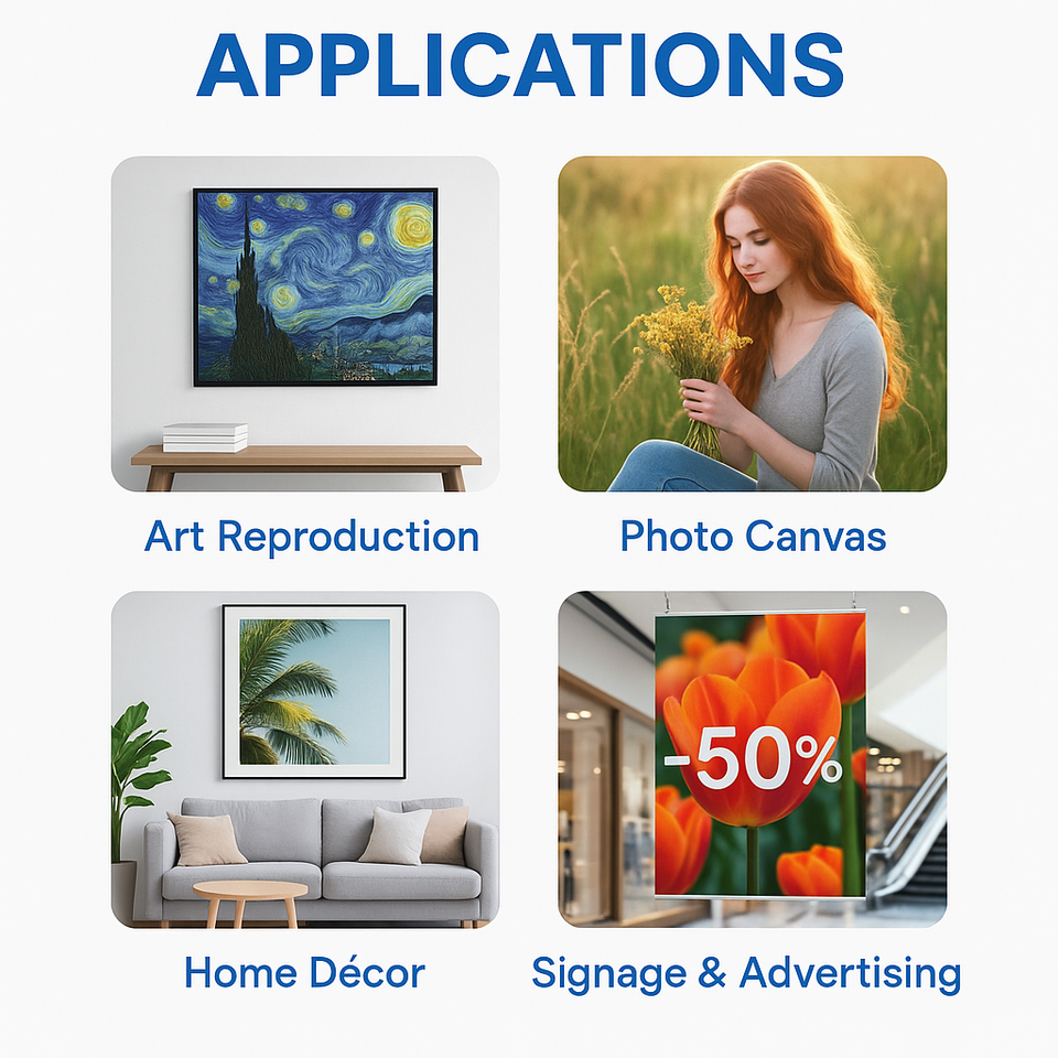 ผ้าแคนวาสพิมพ์อิงค์เจ็ทกันน้ำ 380gsm ผิวด้าน ผลิตจากโพลีคอตตอน สำหรับงานพิมพ์อิงค์เจ็ท ลาเท็กซ์ และอีโคโซลเว้นท์ แบบม้วน เป็นมิตรกับสิ่งแวดล้อม เหมาะสำหรับงานพิมพ์ภาพศิลปะและงานพิมพ์บนป้ายไวนิล