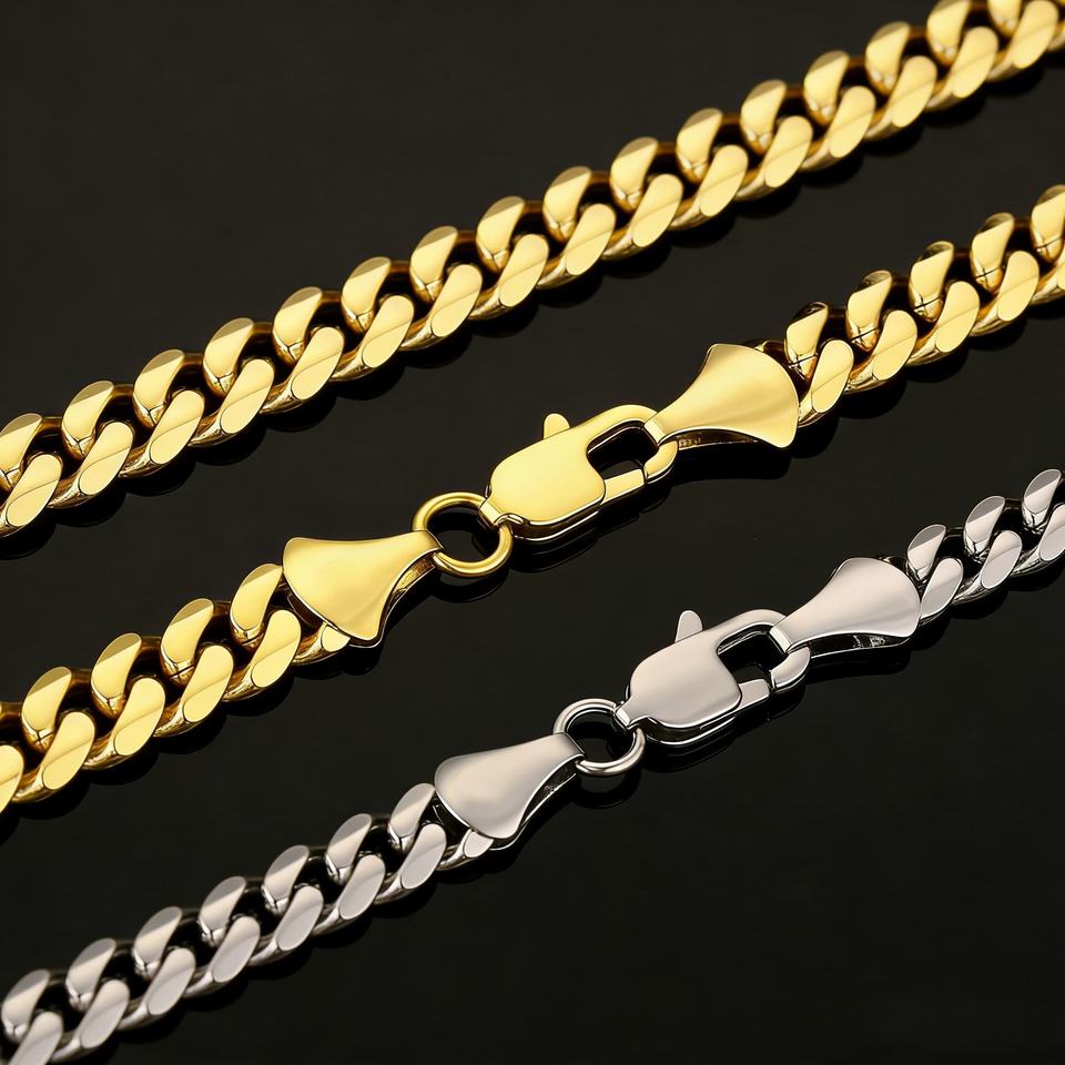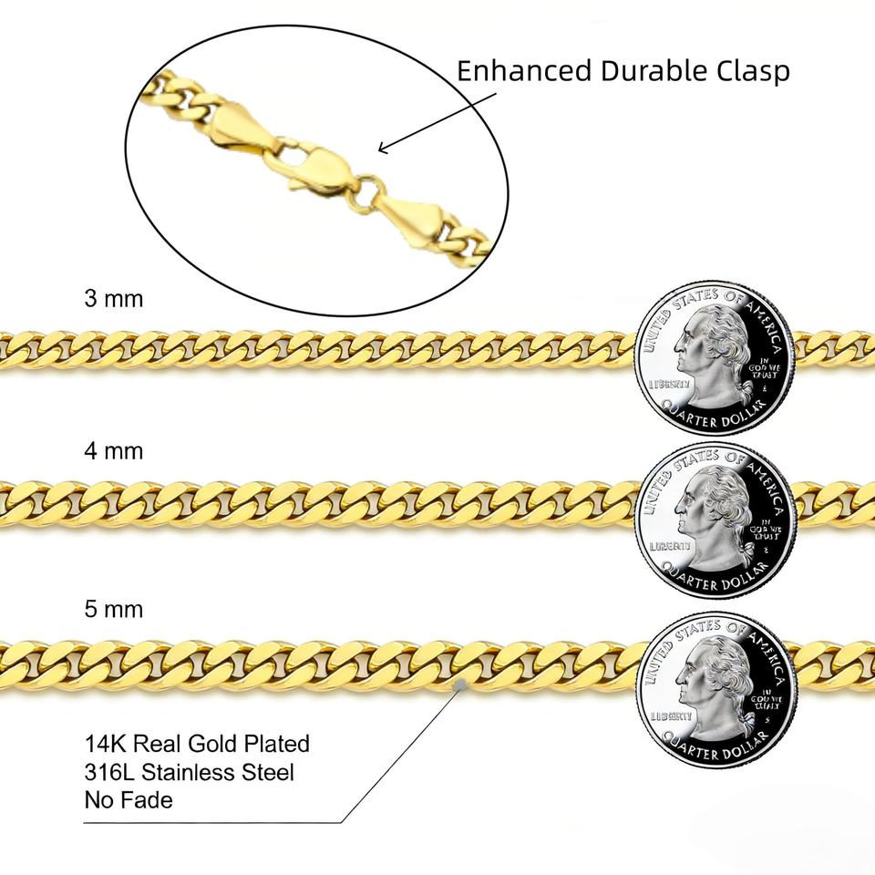 สร้อยคอแบบ Cuban Link สแตนเลสชุบทอง 14k ขนาด 3 มม. 4 มม. 5 มม. 6 มม. 8 มม. พร้อมตัวล็อกแบบก้ามปู สำหรับผู้ชาย ขายส่ง