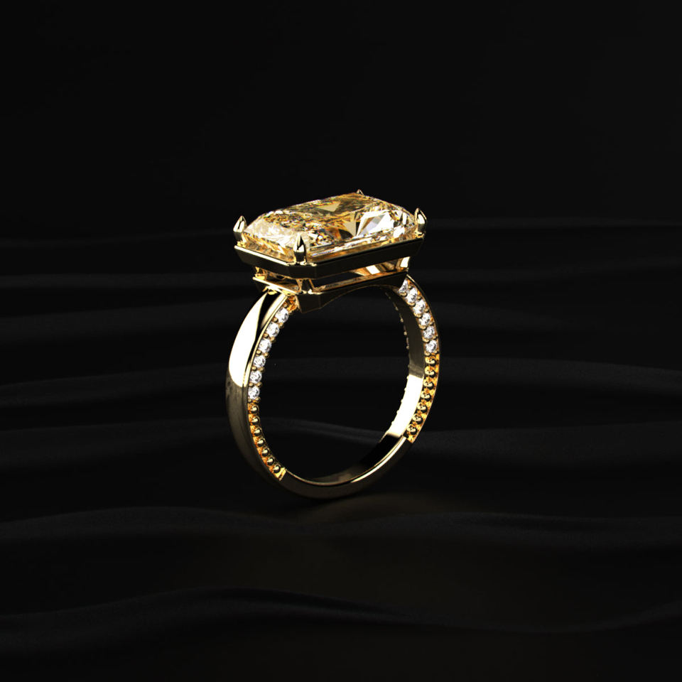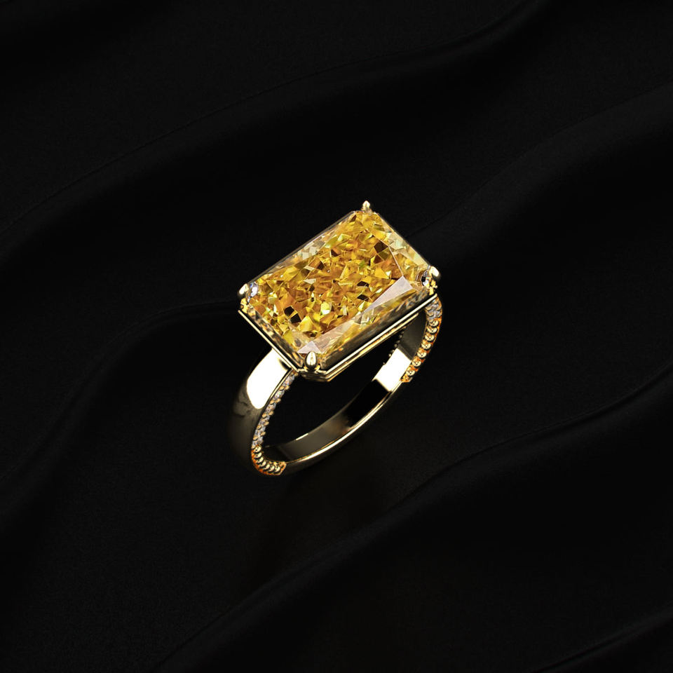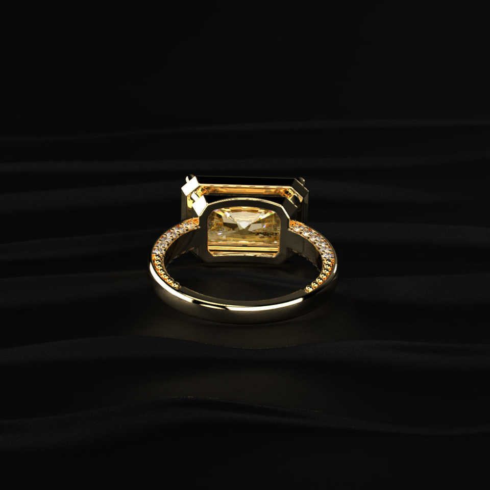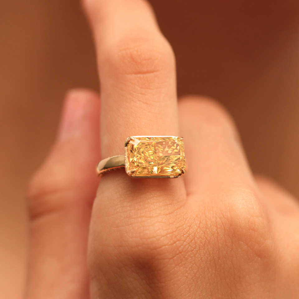 แหวนเพชรโมอิสซาไนต์ทรงเรเดียนท์คัทสีเหลือง 4 กะรัต แบบอีสต์เวสต์โซลิแทร์ ทองคำแท้ 14K ขายส่ง ผู้ผลิตเครื่องประดับสั่งทำพิเศษ