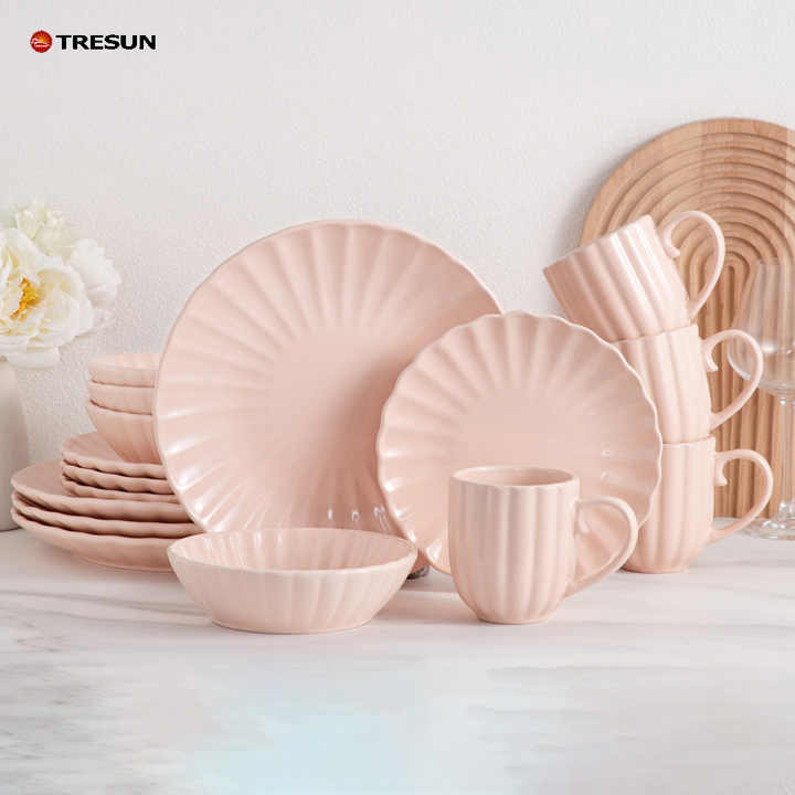 ชุดจานอาหารค่ำเซรามิกพอร์ซเลนสีชมพูเขียวมิ้นท์ลายนูน 16 ชิ้น สไตล์โมเดิร์นหรูหรา ขายส่ง