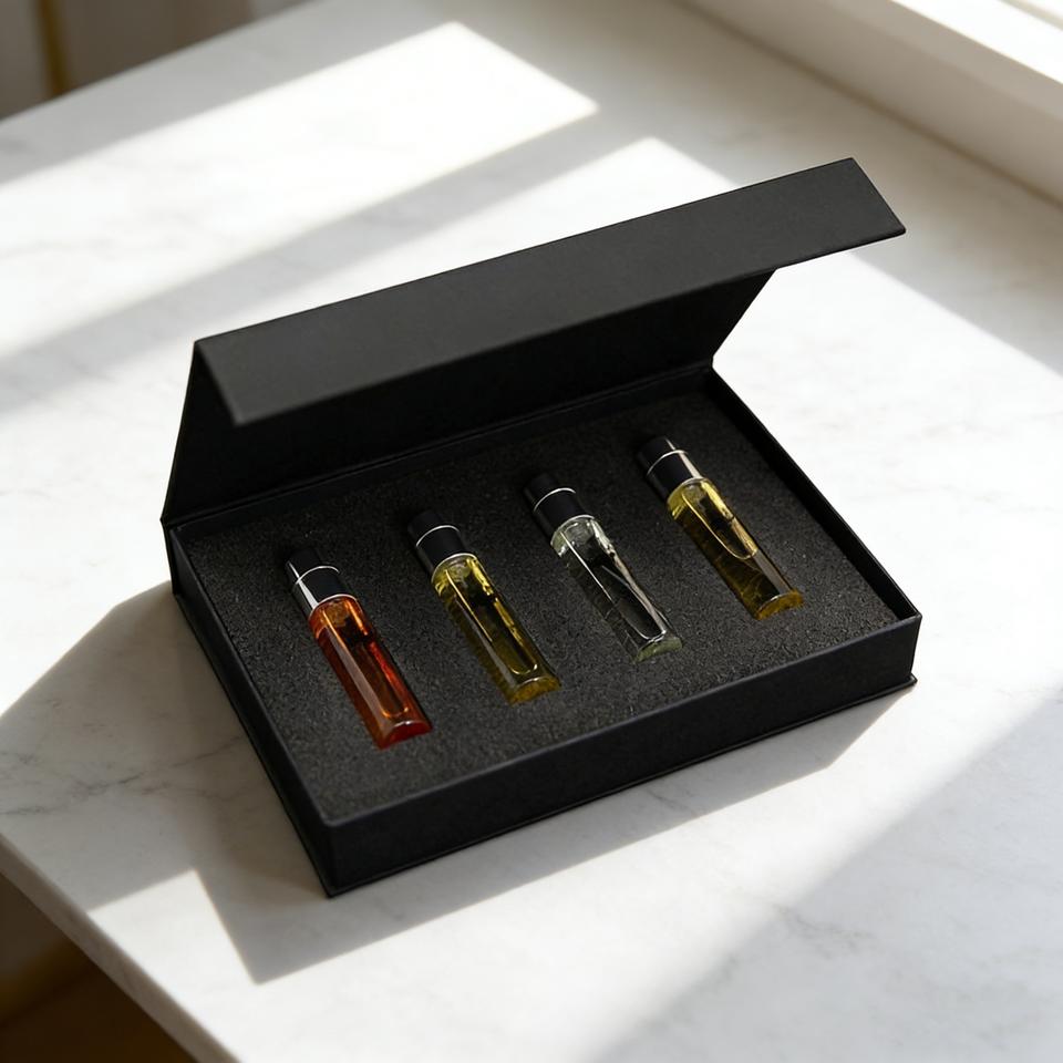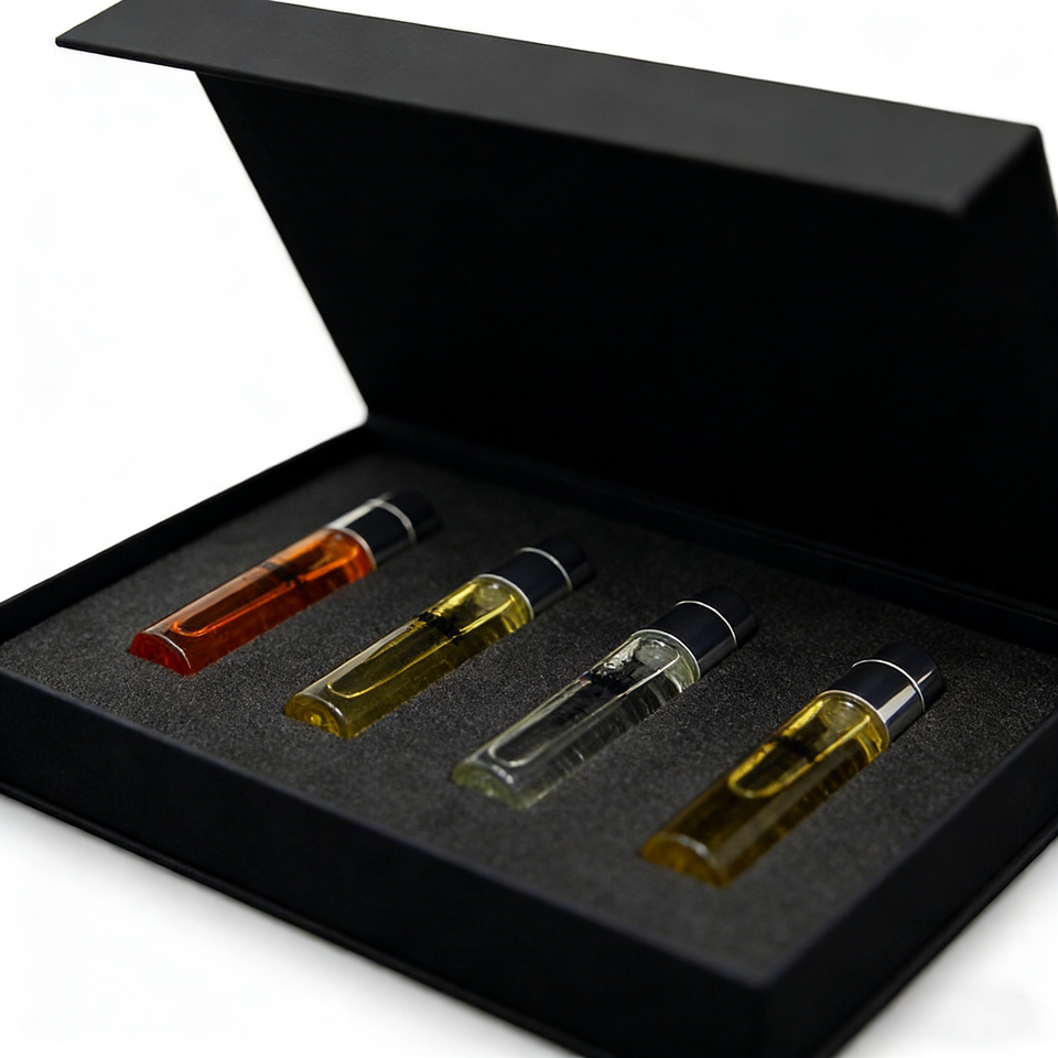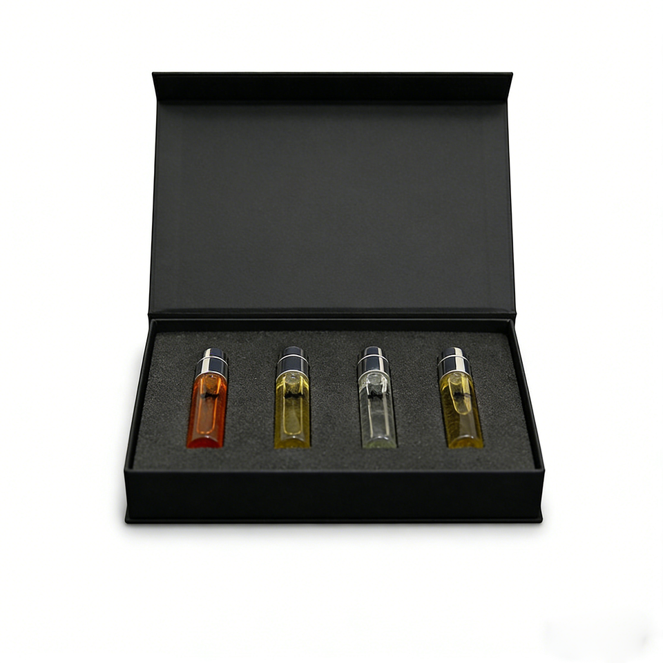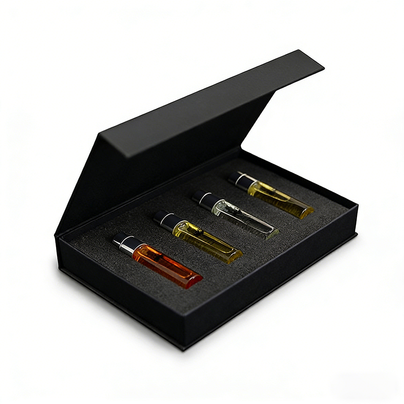 ชุดกล่องของขวัญน้ำหอมแบบขายส่ง 4 ชิ้น ขนาด 10 มล. ขวดแก้วแบบลูกกลิ้งเติมได้ พร้อมบรรจุภัณฑ์พิมพ์ลายตามสั่งสำหรับเครื่องสำอาง