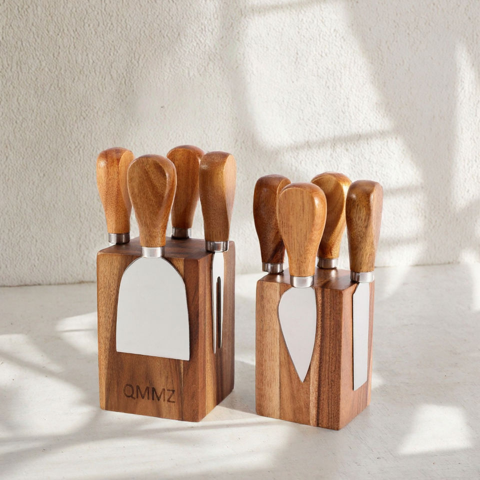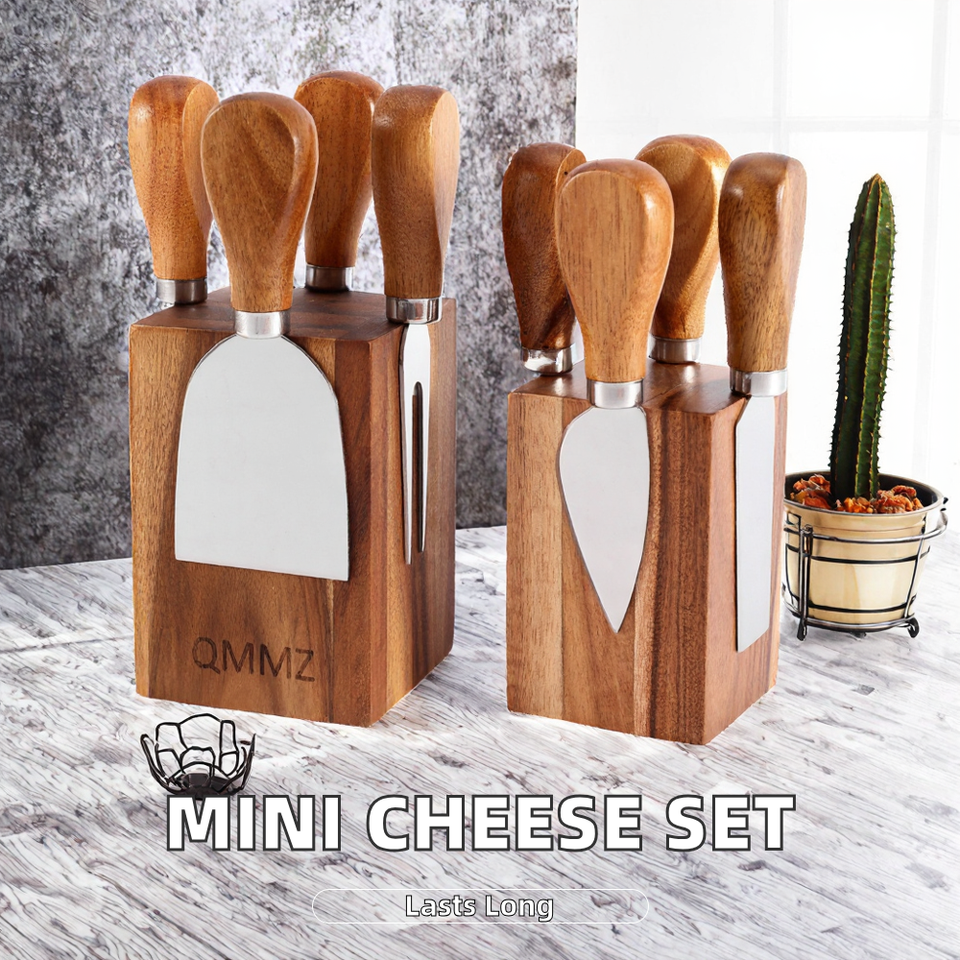 ชุดเขียงชีสไม้กระถินเทศขนาดเล็ก 5 ชิ้น พร้อมที่วางแม่เหล็กและชุดมีดสำหรับเสิร์ฟและจัดวางชีส