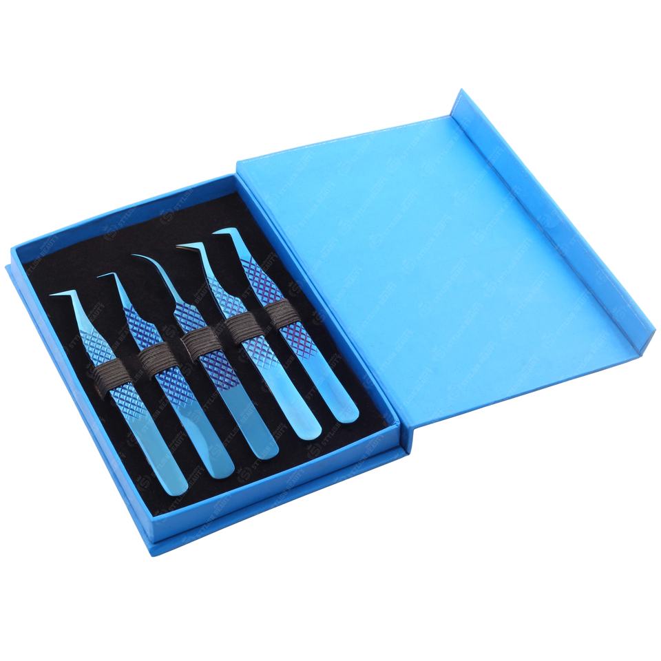 กล่องแหนบต่อขนตา5ชิ้นทำจากสเตนเลสสำหรับการแยกขนตาออกใต้ฉลากส่วนตัว