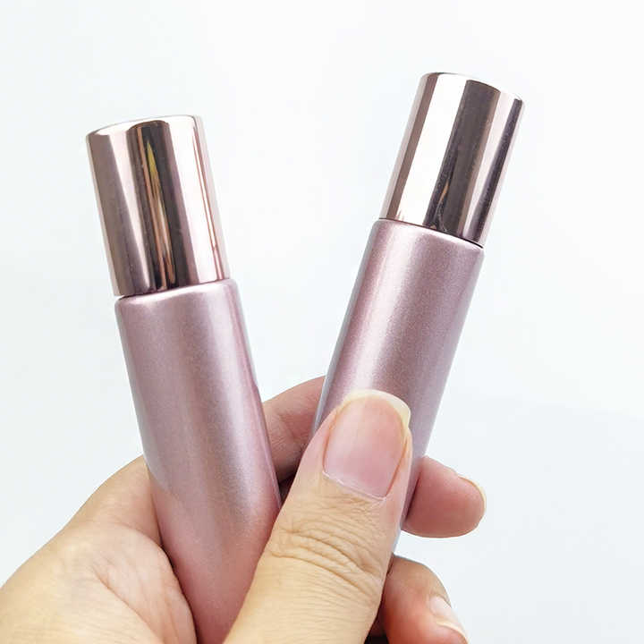 ขวดแก้วโรลออนสีชมพูเมทัลลิกขนาด 5 มล. 10 มล. พร้อมฝาสีโรสโกลด์สำหรับน้ำมันหอมระเหยและน้ำหอม ขายส่ง