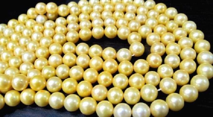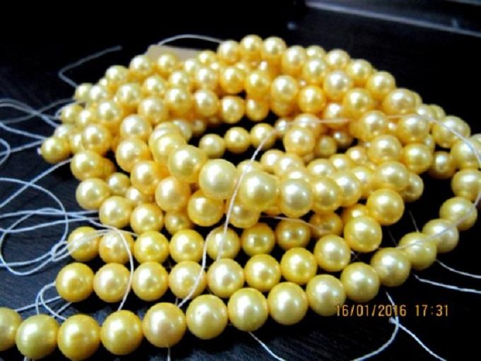 ลูกปัดไข่มุกสีทองธรรมชาติขนาด5มม. ลูกปัดทองมุกสีเหลืองแท้เส้นยาว5นิ้ว