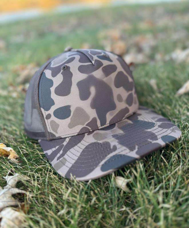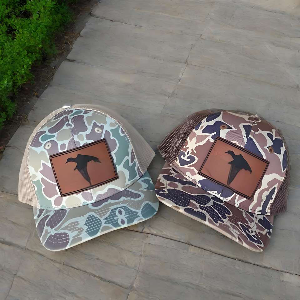 หมวกแก๊ปลายพราง 6 แผง ขายส่ง ปักโลโก้หนังตามสั่ง หมวกทรัคเกอร์ผ้าฝ้ายสีน้ำตาลลายพราง หมวกตกปลาแบบทรัคเกอร์