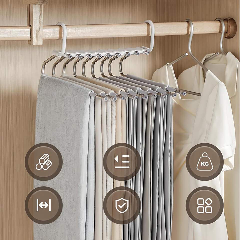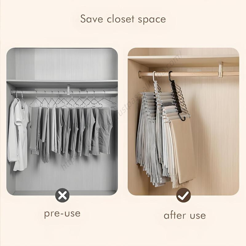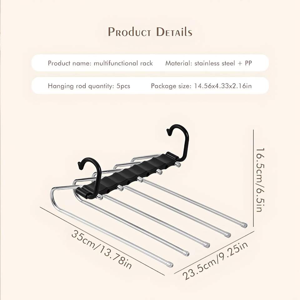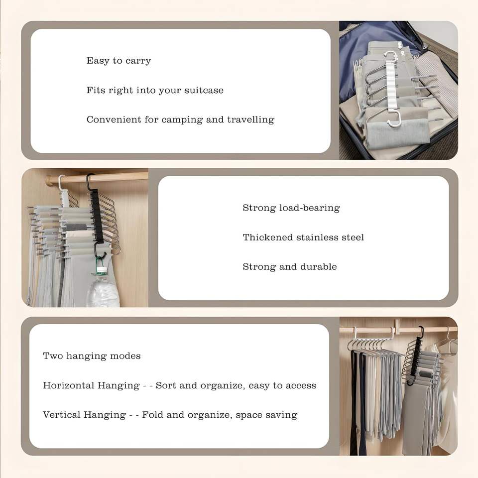 ไม้แขวนกางเกงสแตนเลสแบบปรับได้ 6-in-1 ขายส่ง ไม้แขวนเสื้อผ้าแบบพับได้สำหรับกางเกง
