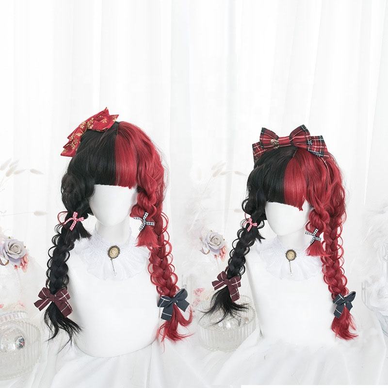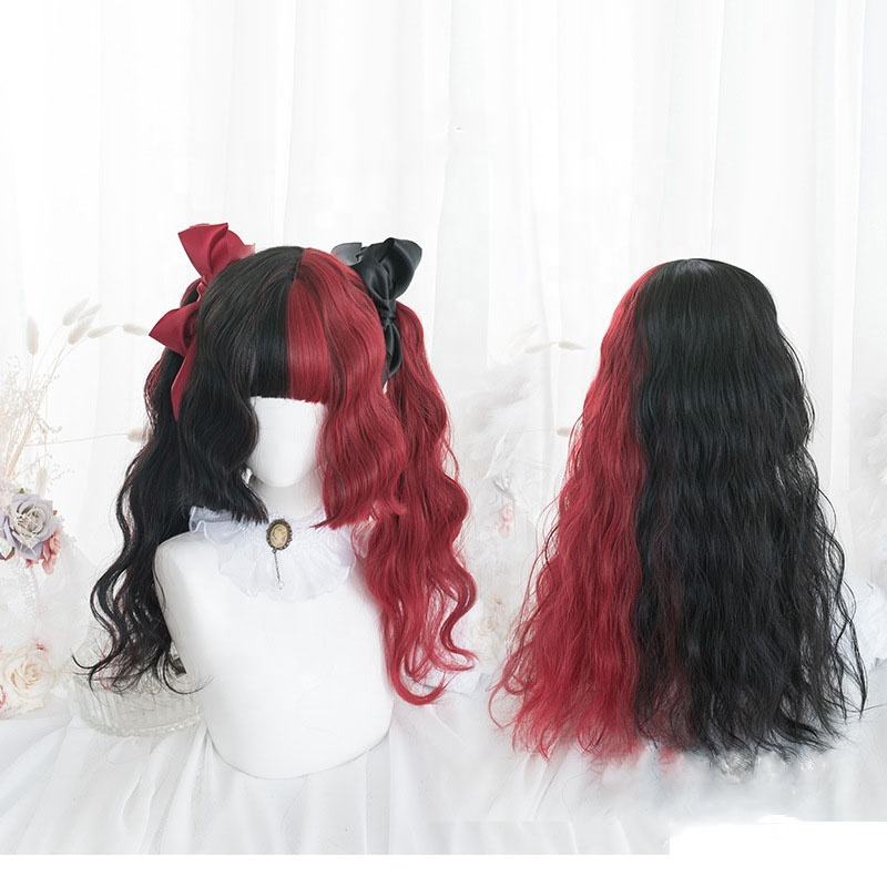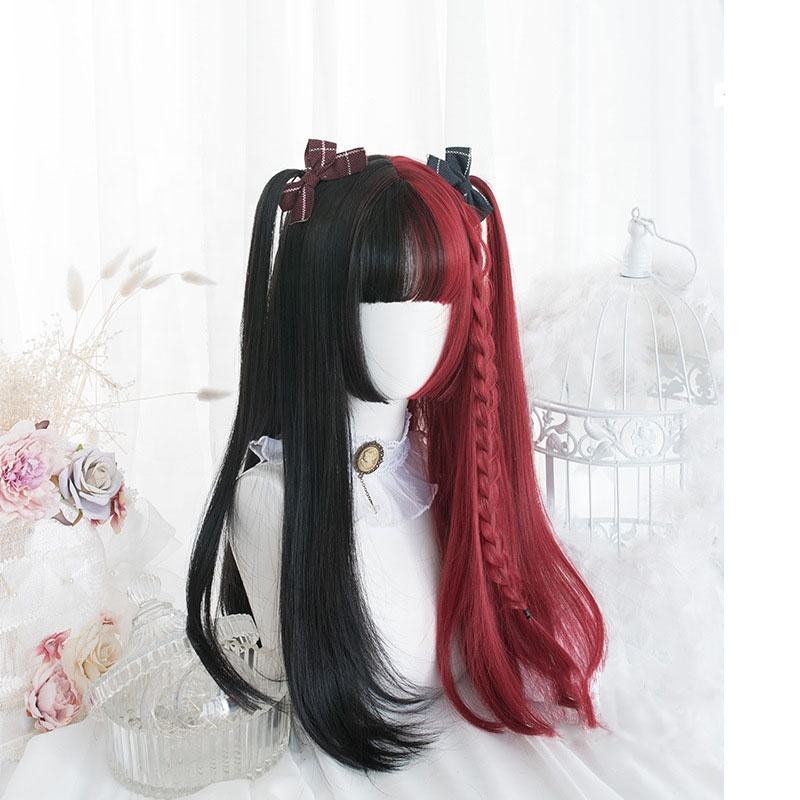 วิกผมยาว 60 ซม. สีดำและแดงเข้มผสม วิกผมเจ้าหญิง วิกผมคอสเพลย์อนิเมะ วิกผมโลลิต้าสำหรับสาวๆ ขายส่ง