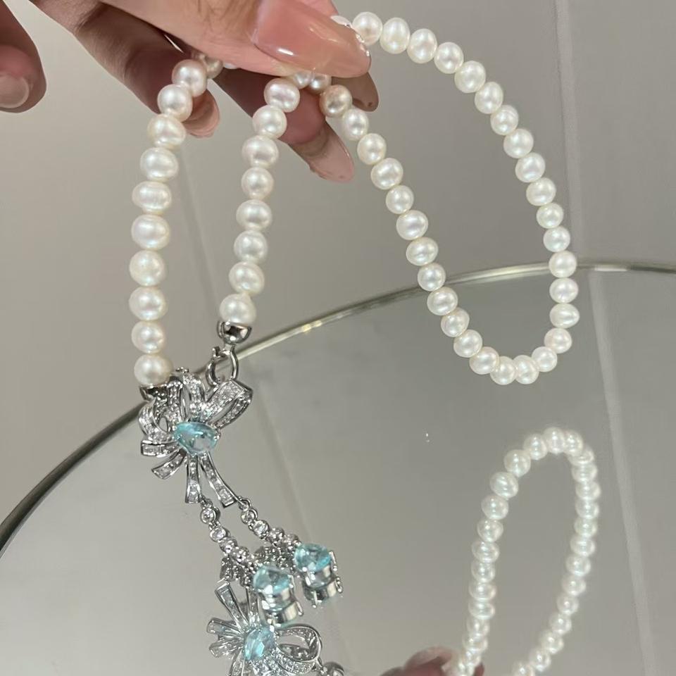 สร้อยคอมุกน้ำจืดขนาด 7-8 มม. สำหรับผู้หญิง พร้อมพู่ห้อยประดับ สร้อยคอแบบโชคเกอร์ ของขวัญเครื่องประดับ สร้อยคอแฟชั่น