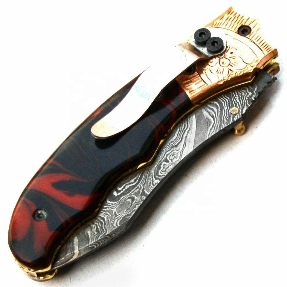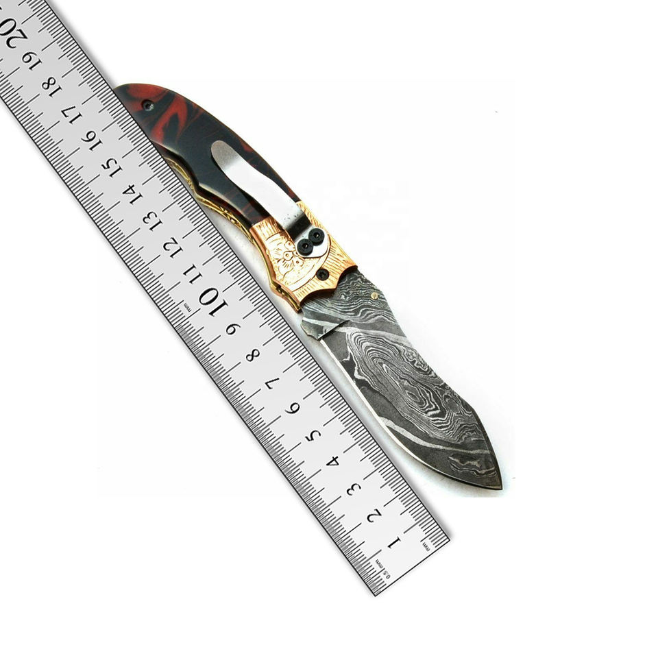 มีดพับพกพาเหล็กดามัสกัสขนาด8 "ทำด้วยมือทำด้วยมือพร้อมปลอกหนังเรซินส่งตรงจากโรงงาน
