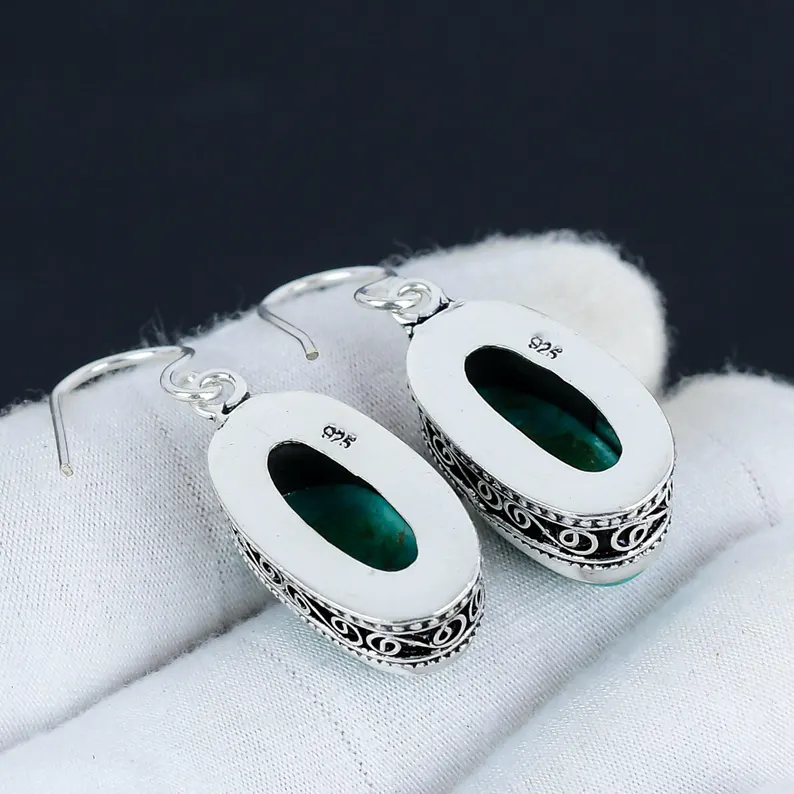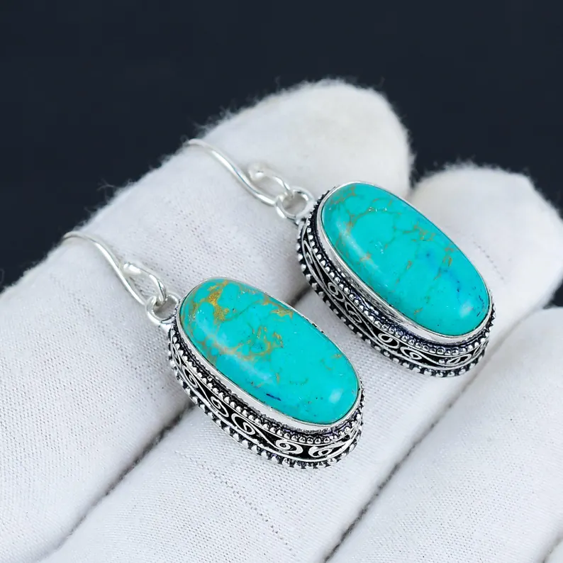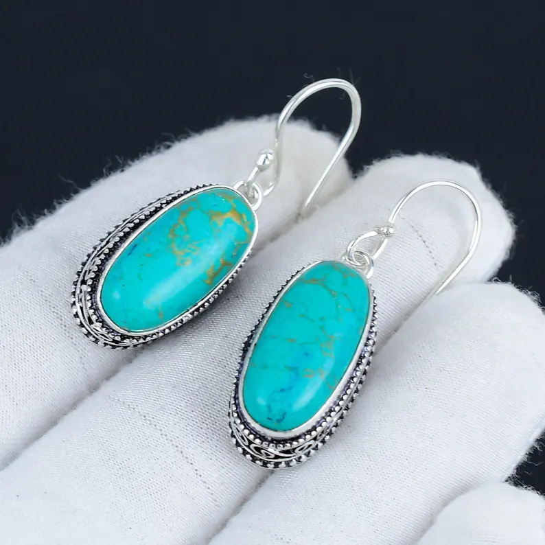 ต่างหูแบบห้อยทำด้วยมือสีเงินแท้925เทอร์ควอยซ์รูปไข่อัญมณีโบฮีเมียนของขวัญความรักคริสเตียน