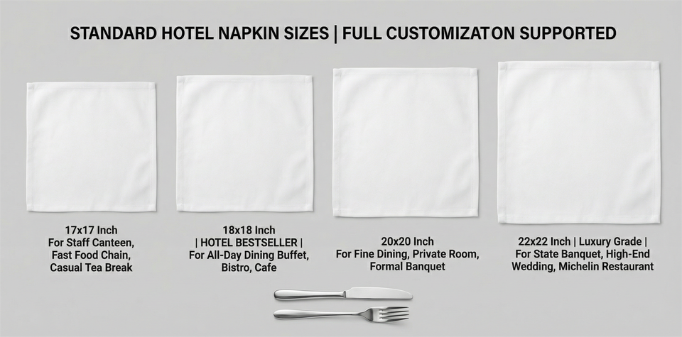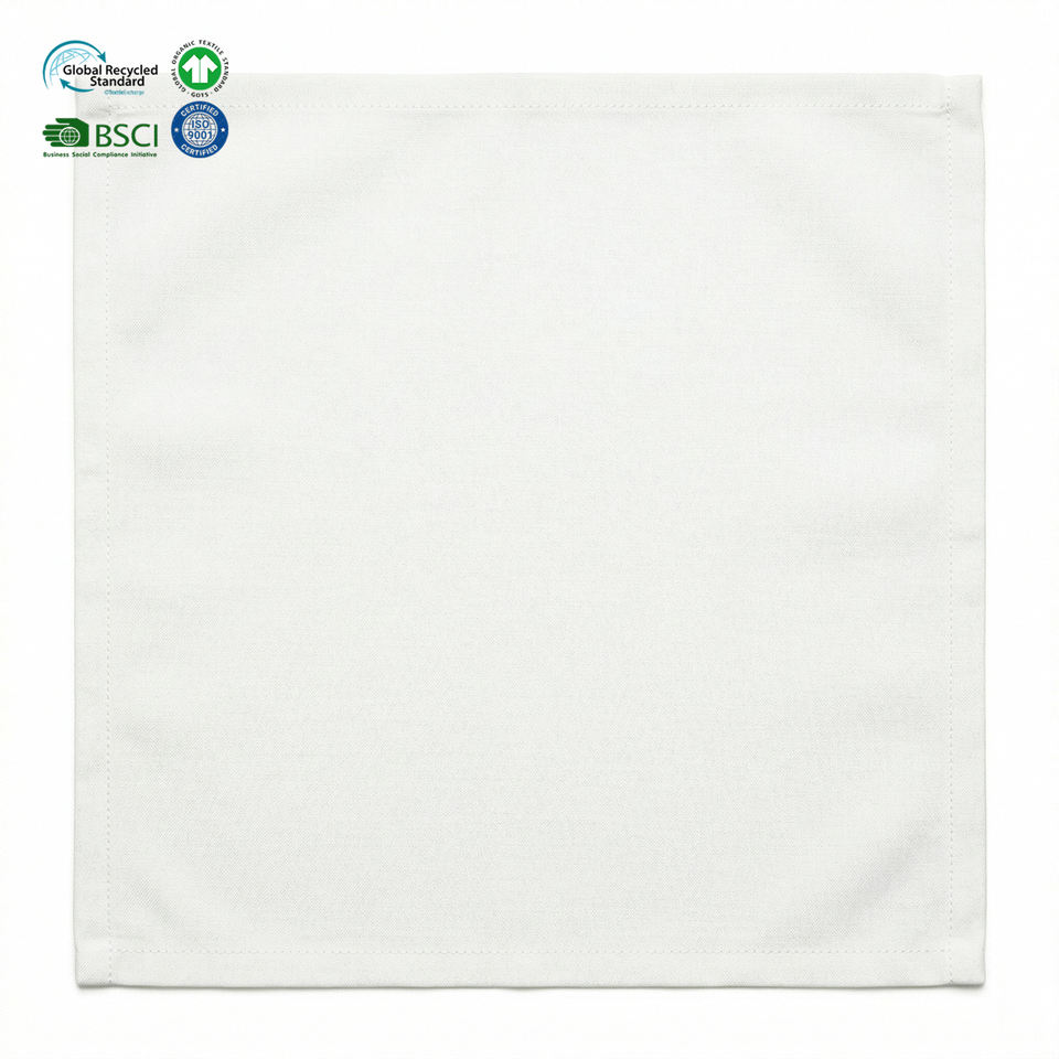 ผ้าเช็ดปากกันน้ำสีขาวขนาด 18x18 นิ้ว ผลิตจากผ้าฝ้ายโพลีเอสเตอร์ ซักได้ ซึมซับดีเยี่ยม ขอบเย็บอย่างดี พร้อมป้ายซักผ้าแบบกำหนดเอง สำหรับงานจัดเลี้ยง