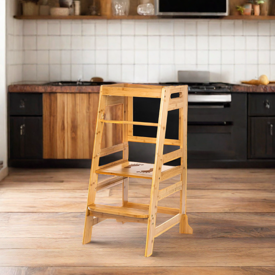 หอบันไดไม้ไผ่ไม้ไผ่ปรับระดับความสูงได้สำหรับเด็กหัดเดินพร้อมกระดานดำสำหรับเคาน์เตอร์ห้องครัว
