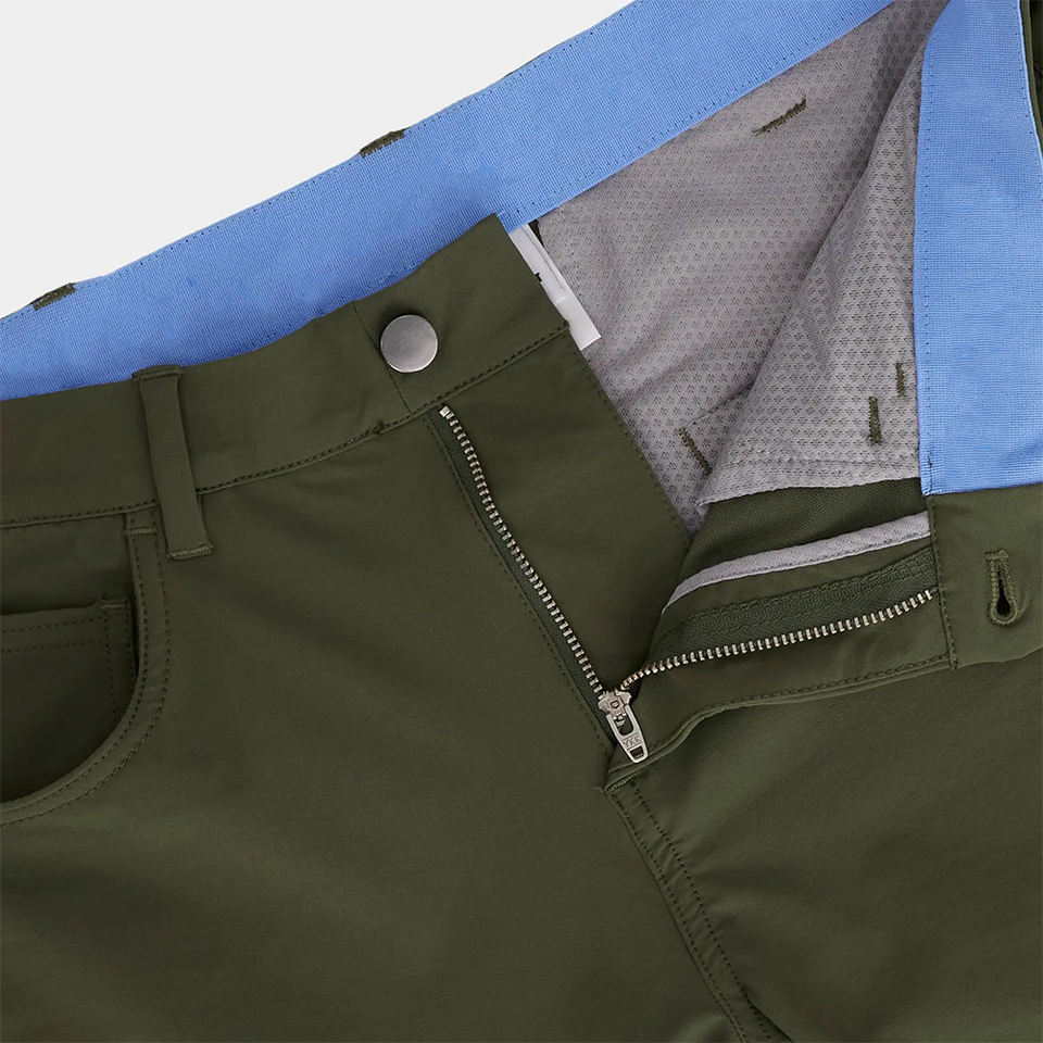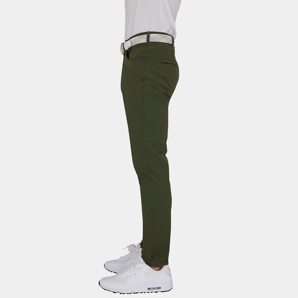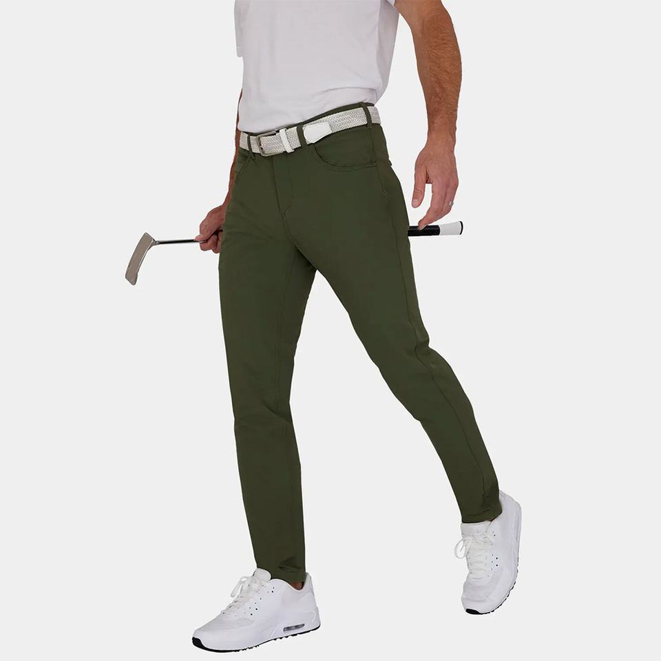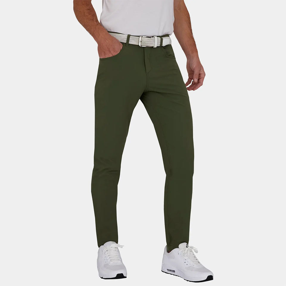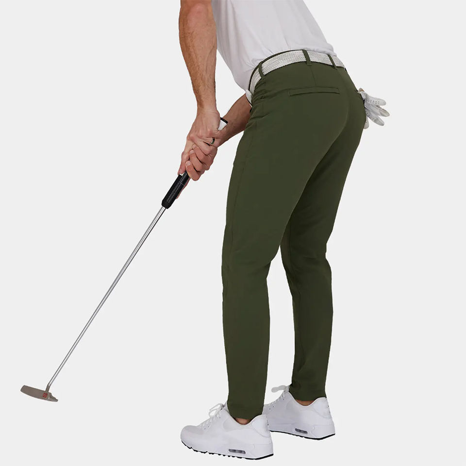 กางเกงกอล์ฟผู้ชายขายส่ง น้ำหนักเบา ระบายอากาศได้ดี ผลิตจากผ้าสแปนเด็กซ์/โพลีเอสเตอร์ สีเขียวมะกอก ทรงลำลอง ยืดได้ เอวกลาง ทรงตรง