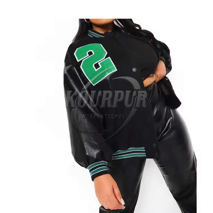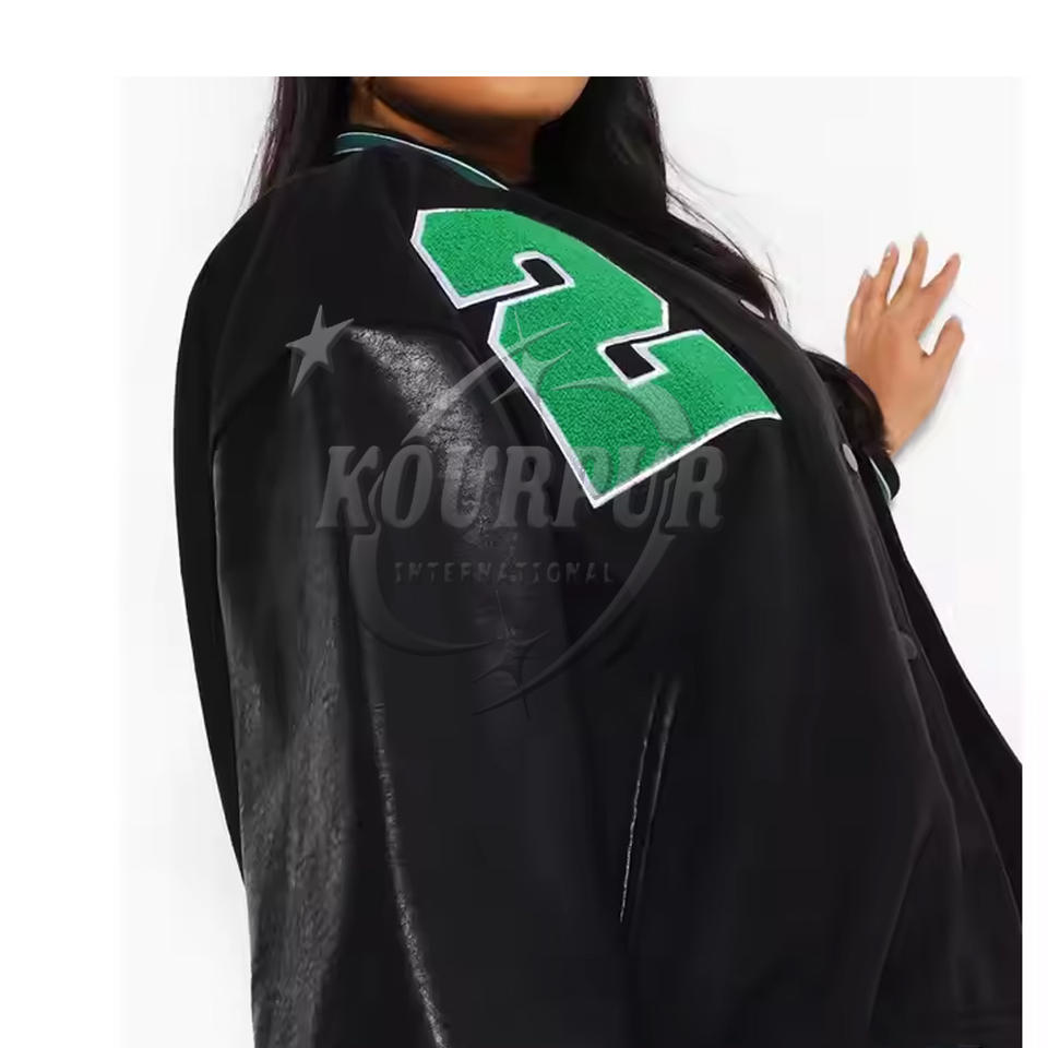 เสื้อแจ็คเก็ตเบสบอลทีมโรงเรียนสีดำและเขียวโลโก้ตัวหนังสือเย็บส่วนบุคคลน้ำหนักเบาสำหรับผู้ใหญ่และวัยรุ่น