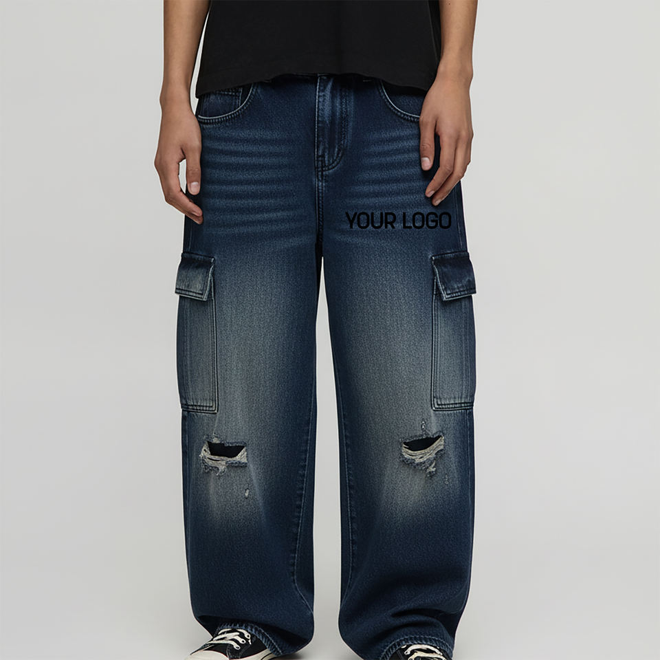 กางเกงยีนส์ผู้ชายทรงหลวมเอวสูงล้างด้วยหินสีเข้มมีกระเป๋าหน้าสินค้าขายดี