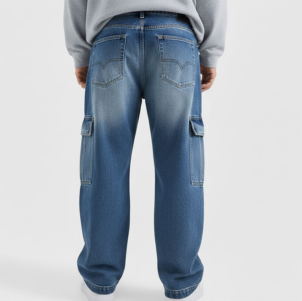 กางเกงยีนส์ทรงตรงสีฟ้าอ่อนแบบสโตนวอช ราคาส่งถูก ผลิตจากผ้าฝ้าย 100% หนัก 14 ออนซ์ มีกระเป๋าแบบคาร์โก้