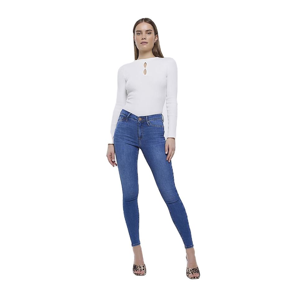 กางเกงยีนส์เอวปานกลางทรงสกินนี่สีพื้น